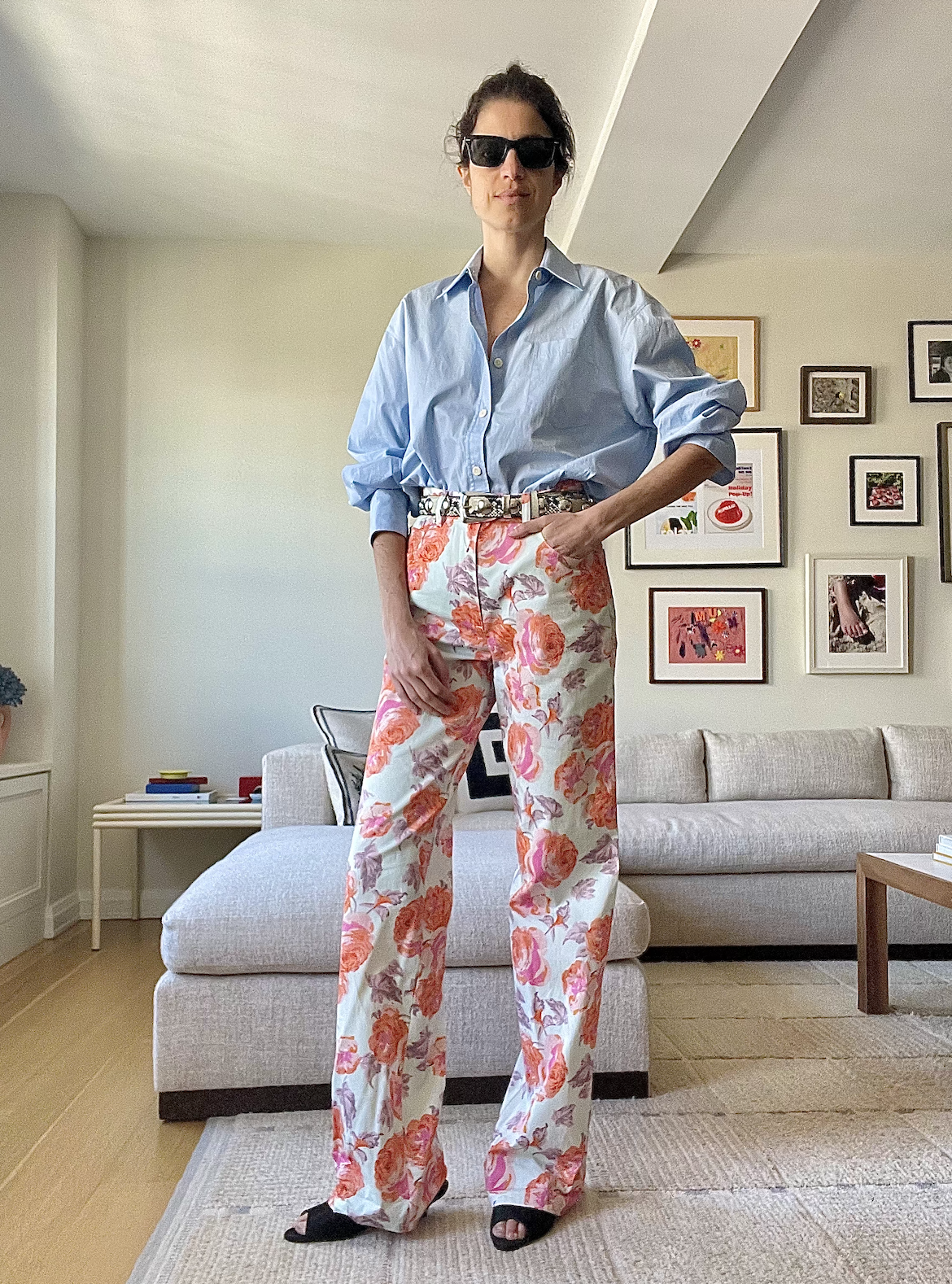Maria McManus shirt, Khaite belt, St. John pants (here’s a better priced alt), Doen sandals