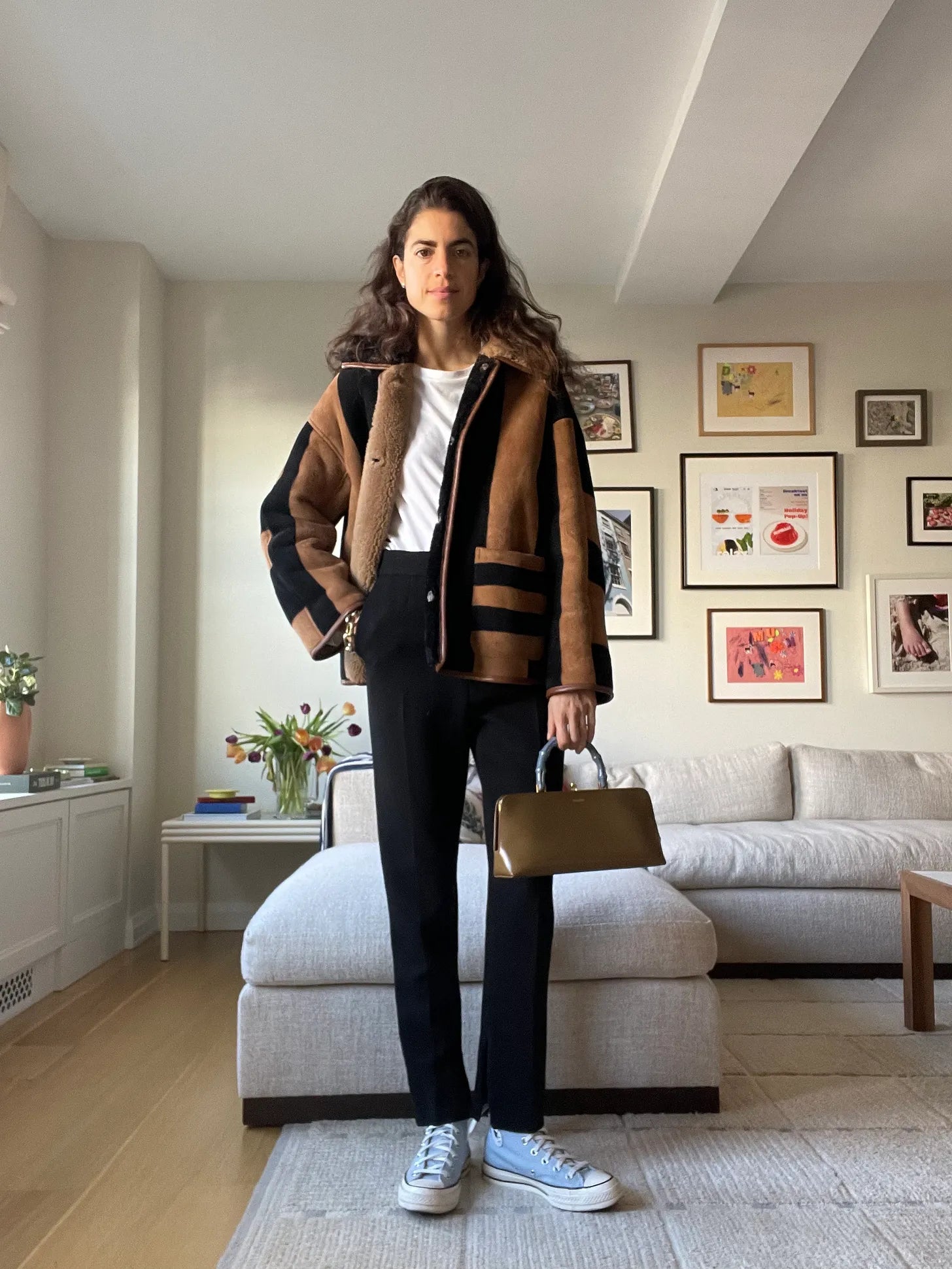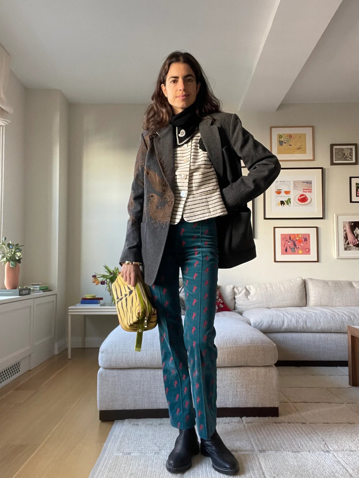 This was a fun one to make! With a Dries van Noten blazer (this one from Sandro is really good too!) I bought ten years ago layered over a Chanel jacket I bought second hand — this too could work! and these Chloe horse pants from about 5 years ago (another vibe that’s not a no), plus a tiger print toiletry clutch from when Man Repeller made accessories (it retailed for $65, so this is lol) and early days boots from The Row that look a bit like Doc Martens