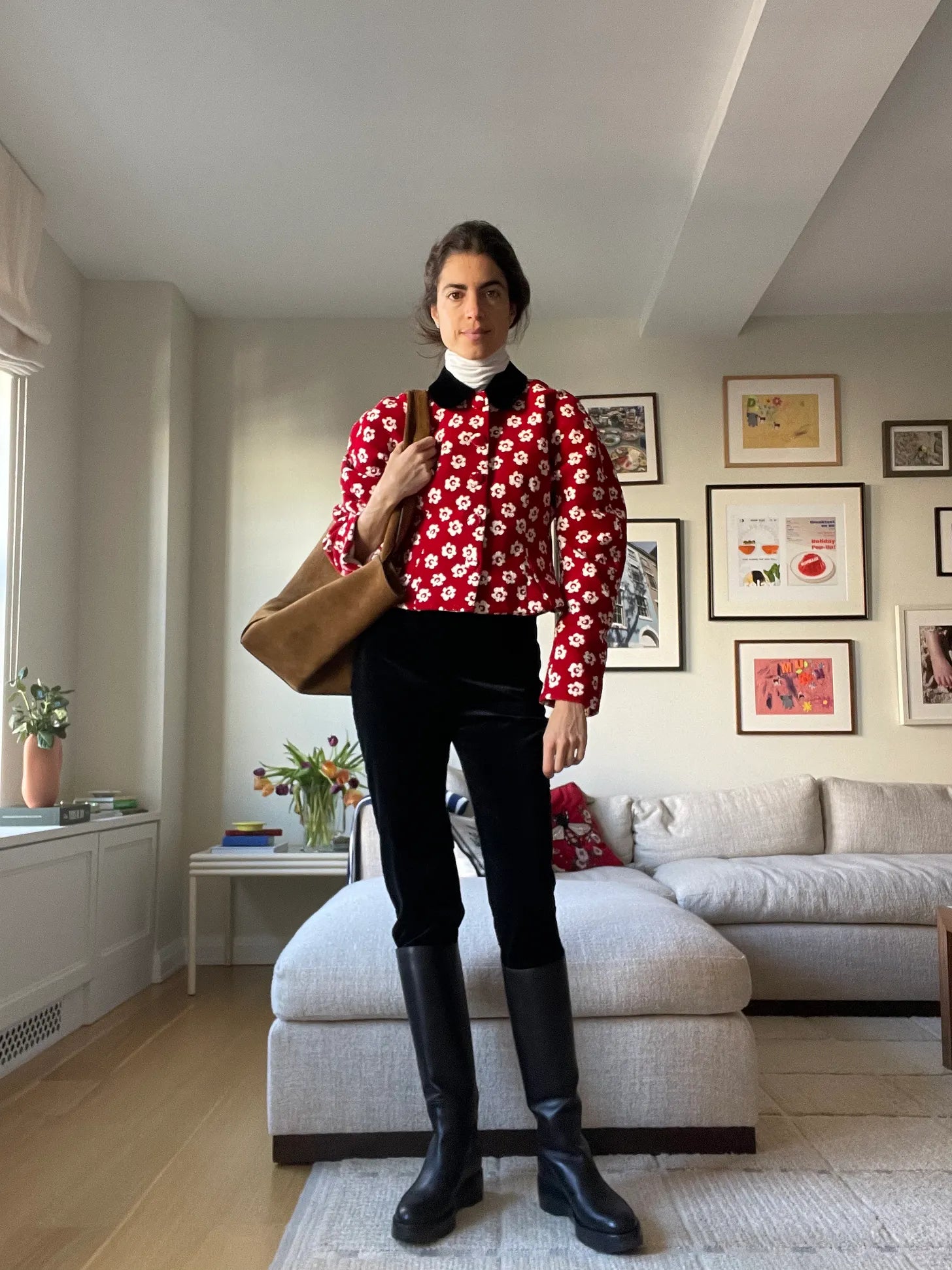 Metier bag, Tory Burch jacket, and here are some good velvet pants/comparable boots