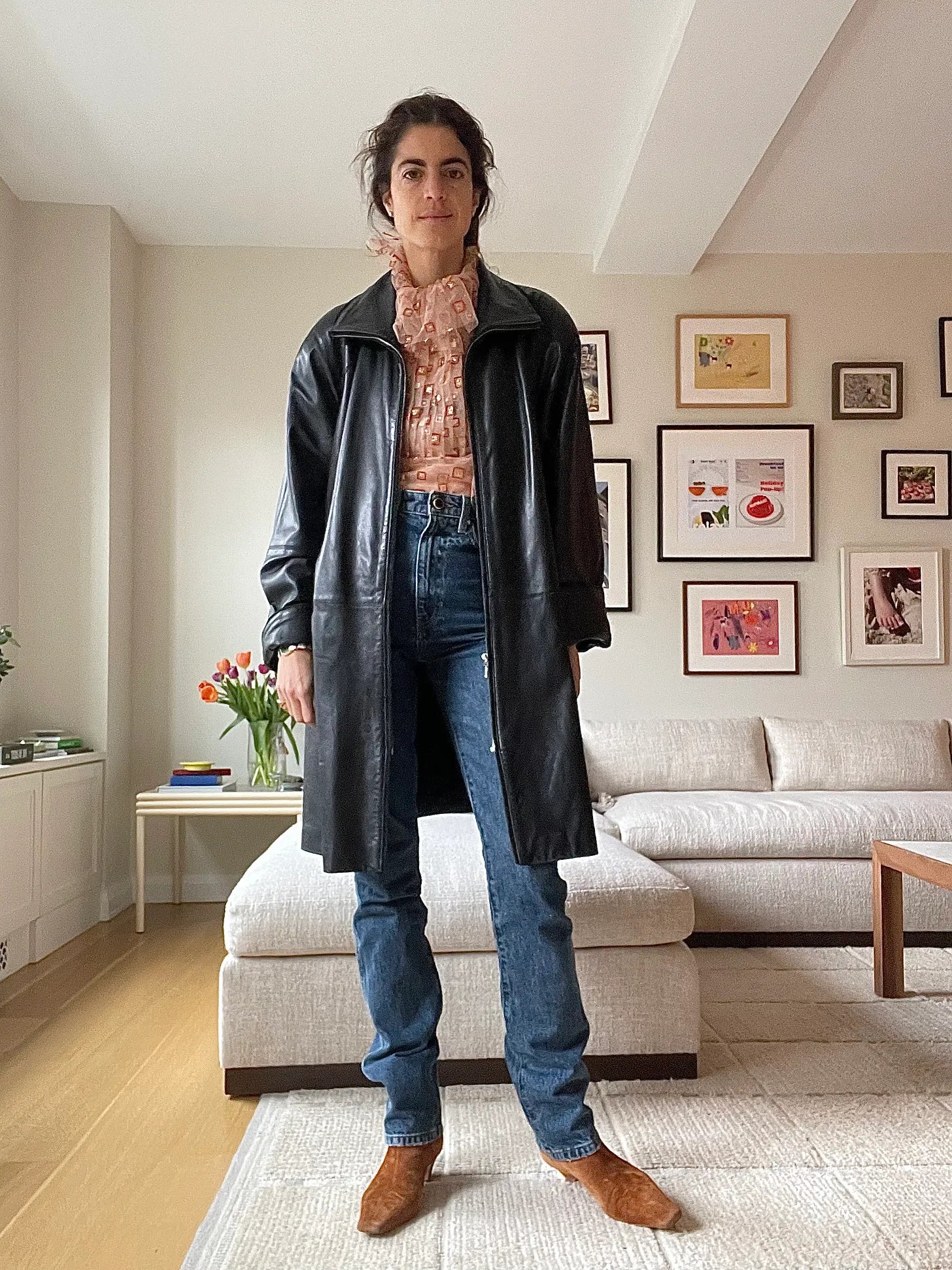 Here’s a leather jacket I took off my grandma’s body a couple of weeks ago, she bought it in Turkey, where she is from, like 25 years ago. The top is Rachel Comey, the jeans are Khaite’s Daria style (the ones below too, but in a darker wash). Ditto that the boots