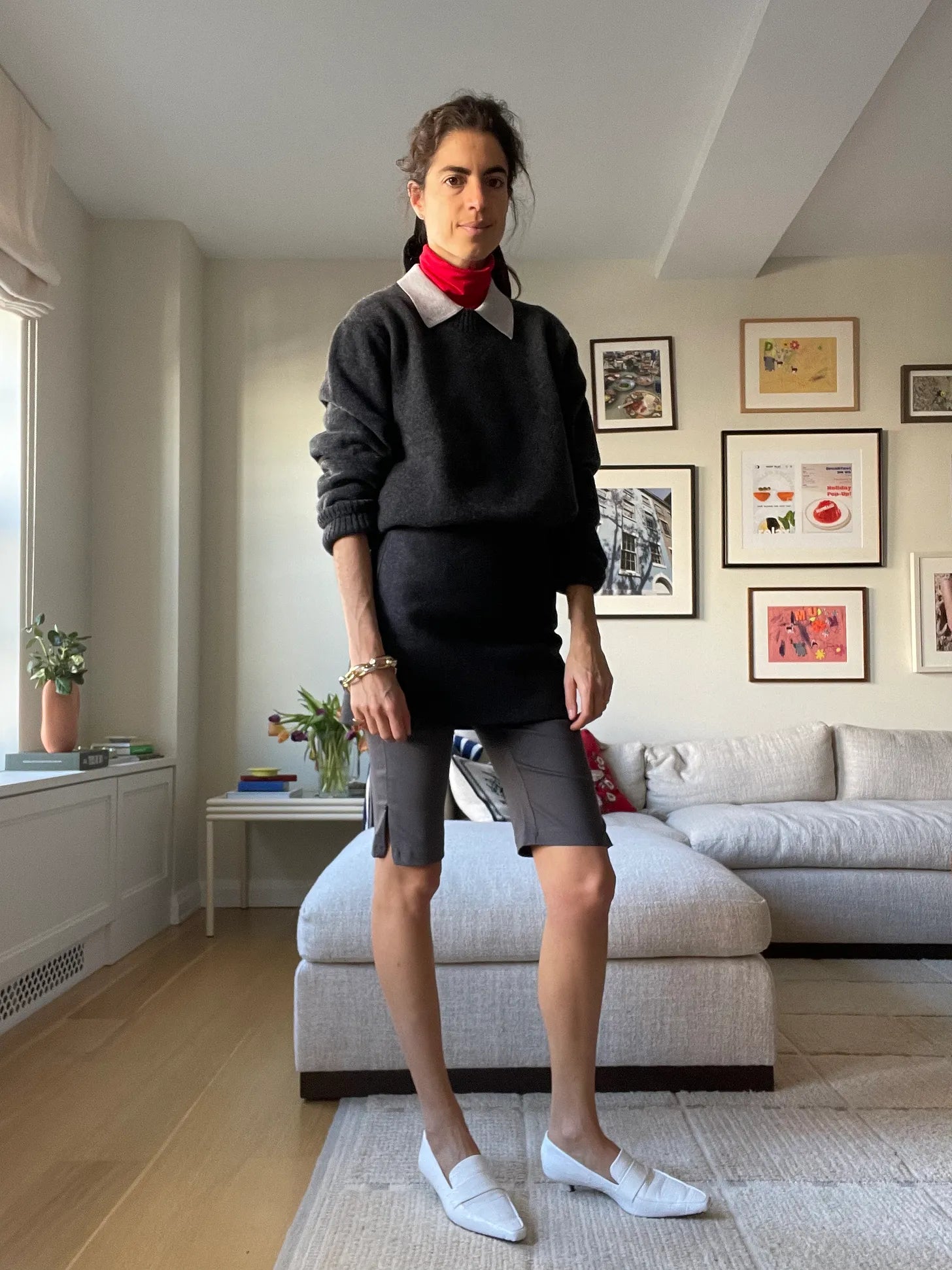 Is it holiday party dressing szn yet or what? Here’s a red t-neck, it’s a worthy investment, and you can easily reapproximate my knit polo layered under the big grey knit. The skirt is from Mango and the shorts are Gabriel Forsach, but any cycling pair should do. Shoes are Toteme. Eventually these will go on sale, right?