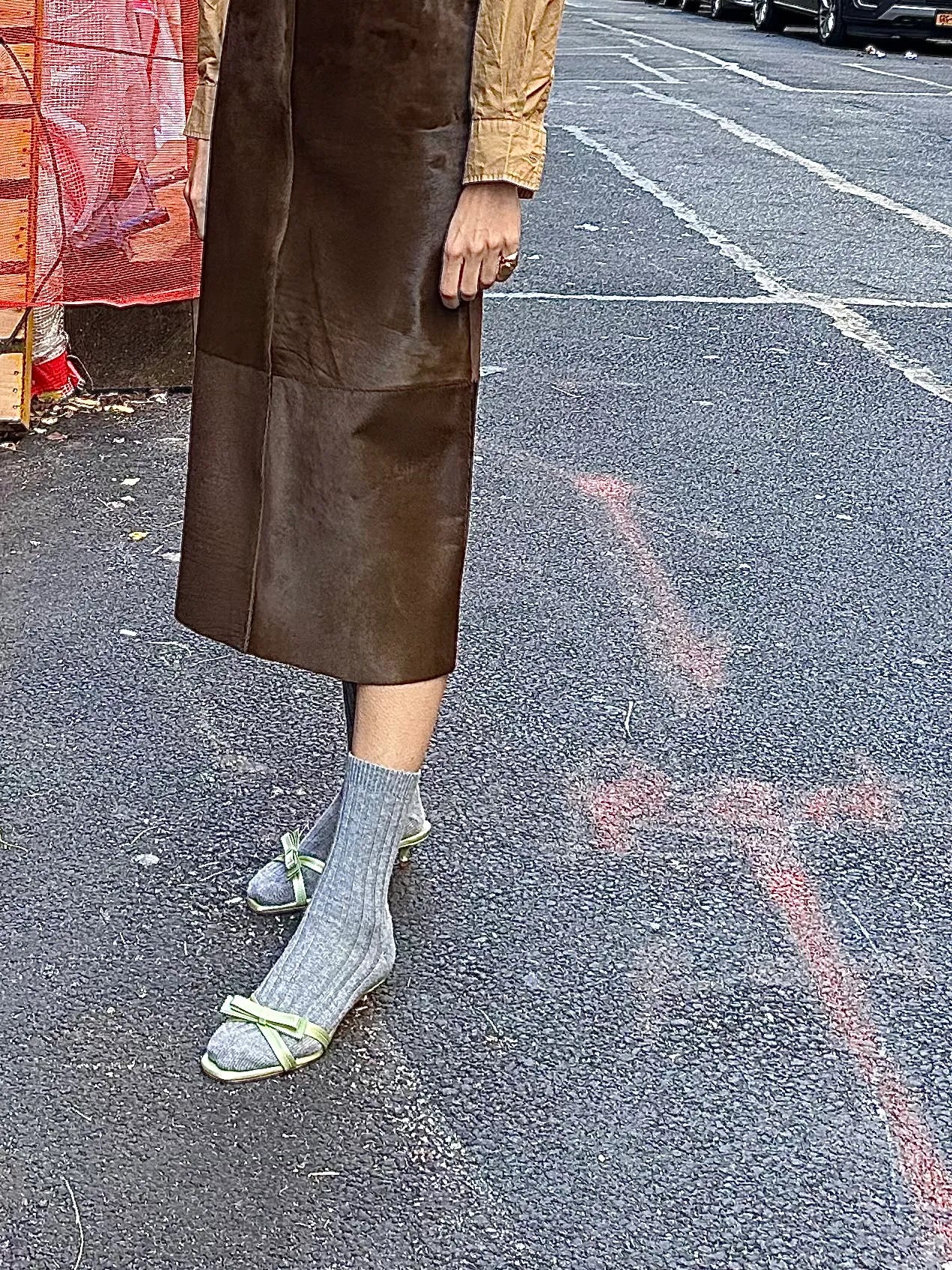 LMND button-down shirt (in toffee), Vince skirt (here is the plain leather version…I like this knit skirt from Lisa Yang as an alt), Swedish Stockings socks, Arteana shoes (unrelated, but related)
