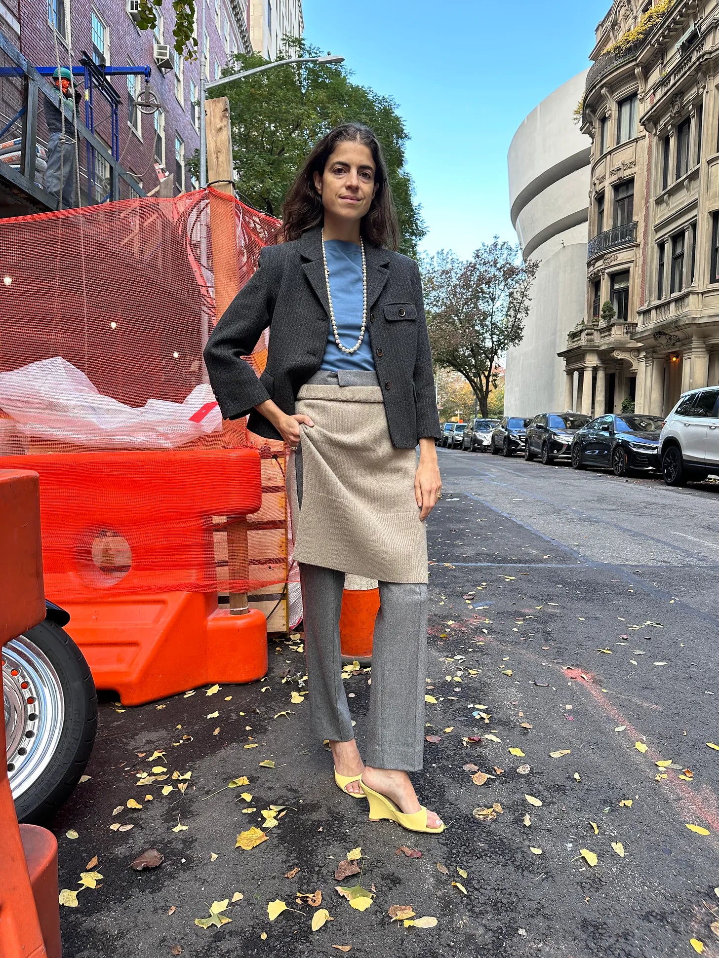 The Garment jacket, Bally t-shirt (this is a good color ref), Chanel necklace (I’m telling you, though, I’m feeling these), Lisa Yang knit top which I’m wearing as a skirt styled over Maria McManus pants, which seem to be entirely sold out but here are these on final sale from The Row for $323 and these from Toteme and then…hi.