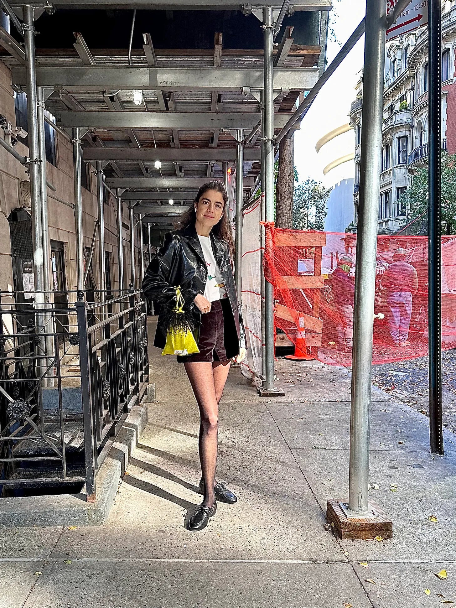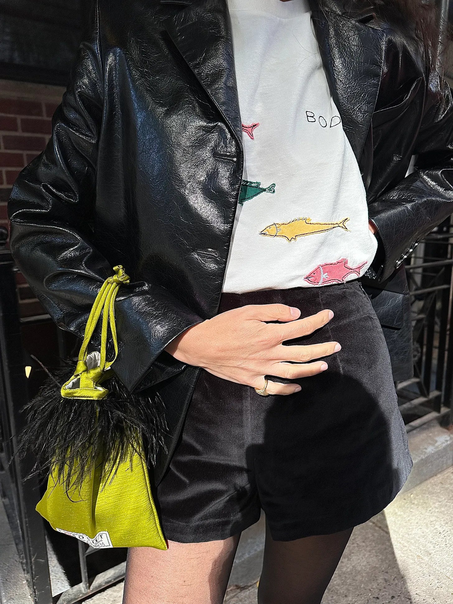 A dose of whimsy in the form of a fabric bag — color can really be any to the extent that it defends on your outfit. Here I’m wearing a rigid leather blazer with velvet shorts, sheer tights, leather boat shoes and a cheeky t-shirt that correlates nicely back to the bag, but the real elements it is playing with are the jacket and shorts, the bread bookends of the look.