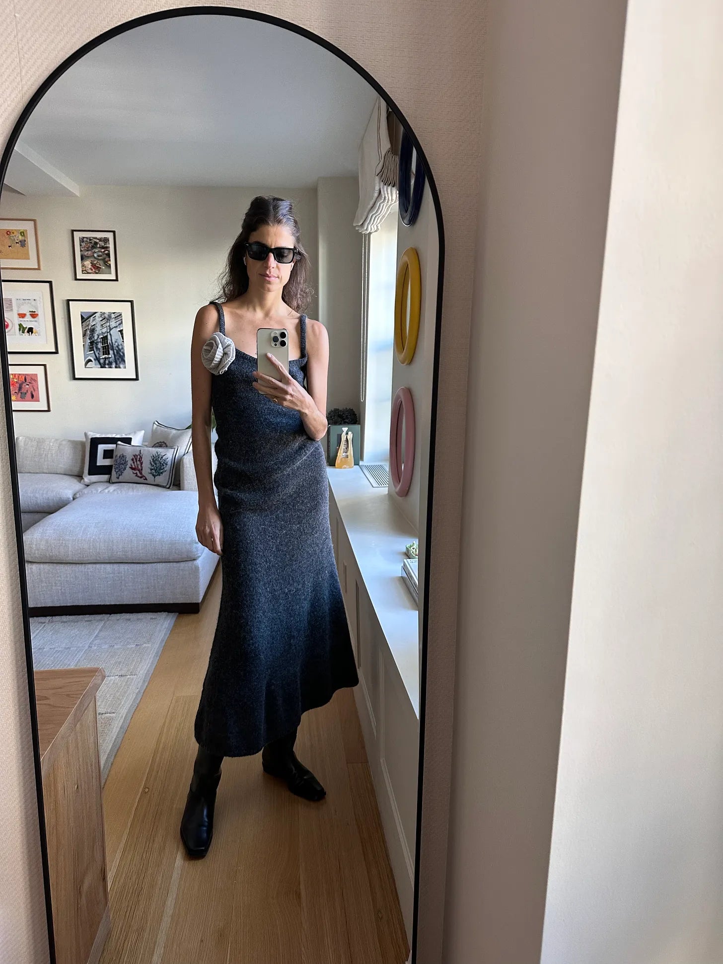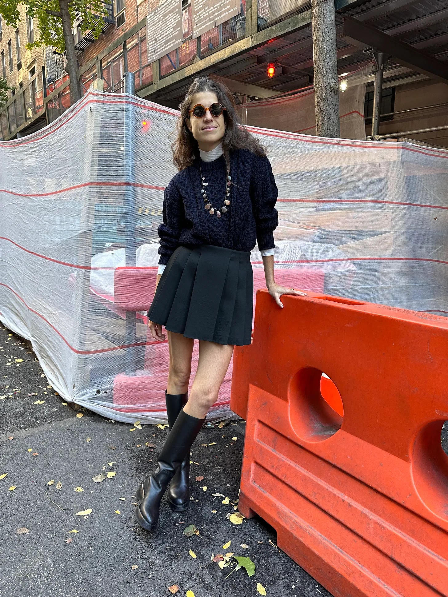 Marisa Klass necklace, St. Agni white t-neck, &Daughter sweater, Dice Kayek skirt (another one here with a bow accent, and this is more performance and here’s !Khaite!, then this vegan leather looks good), The Row boots — thoughts on these?
