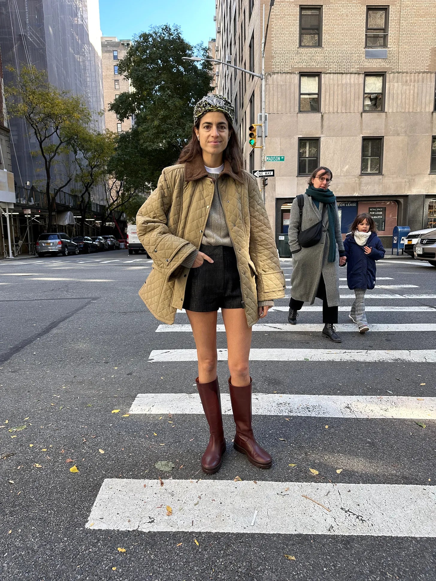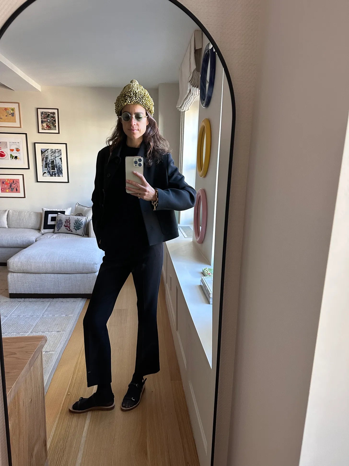 Jenny Walton hat, Veronica de Piante jacket, Max Mara pants (really like the khaki too, and uh, what are your thoughts on Spanx?), sheer socks and Gabriela Hearst sandals (here at $210 for the 7.5 among us)