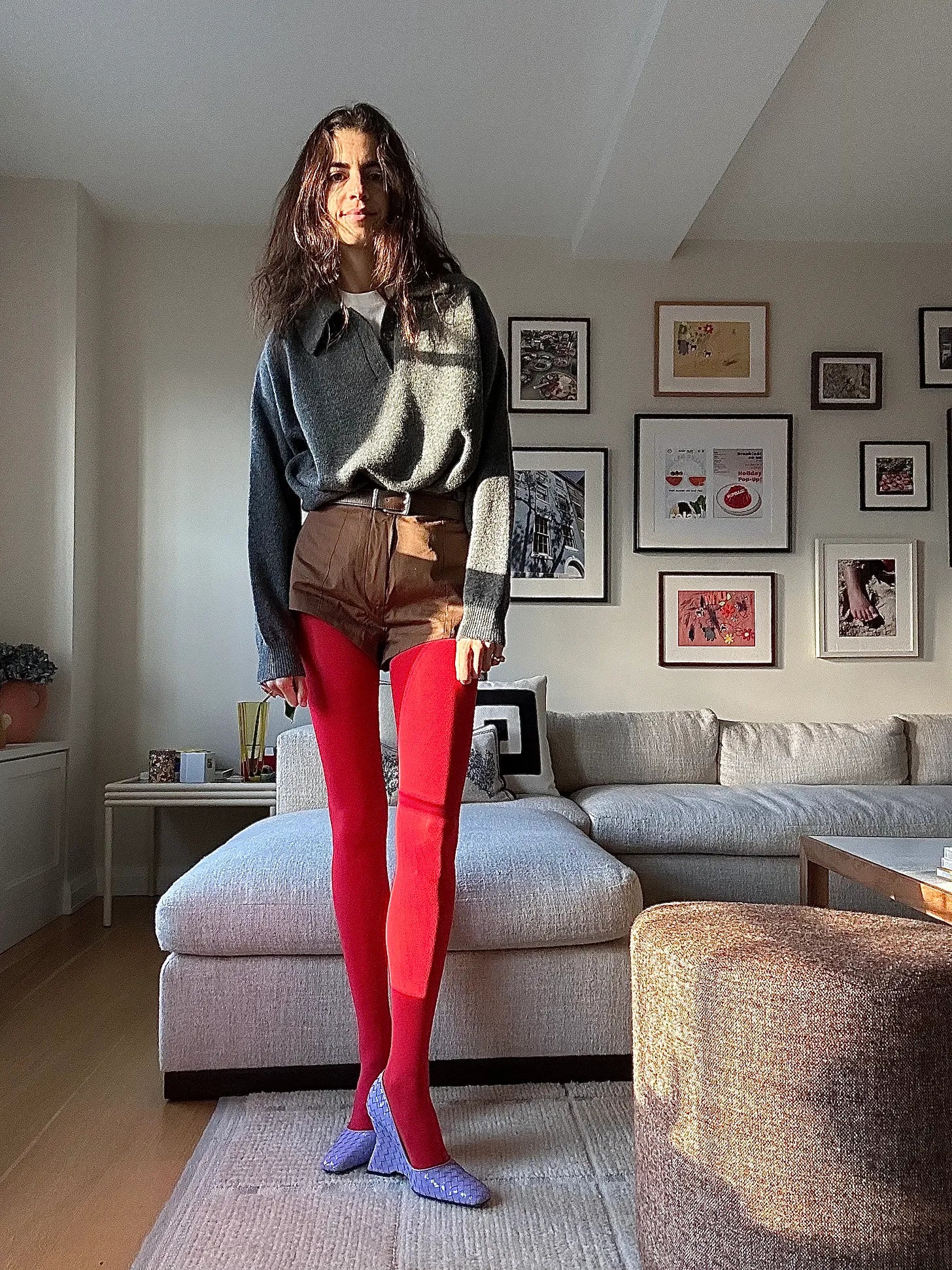 & Daughter polo sweater (for reference, I’m wearing a size small), Amotea brown shorts, Beaufille belt, Swedish Stockings “sharp” red tights, Bottega Veneta purple wedges