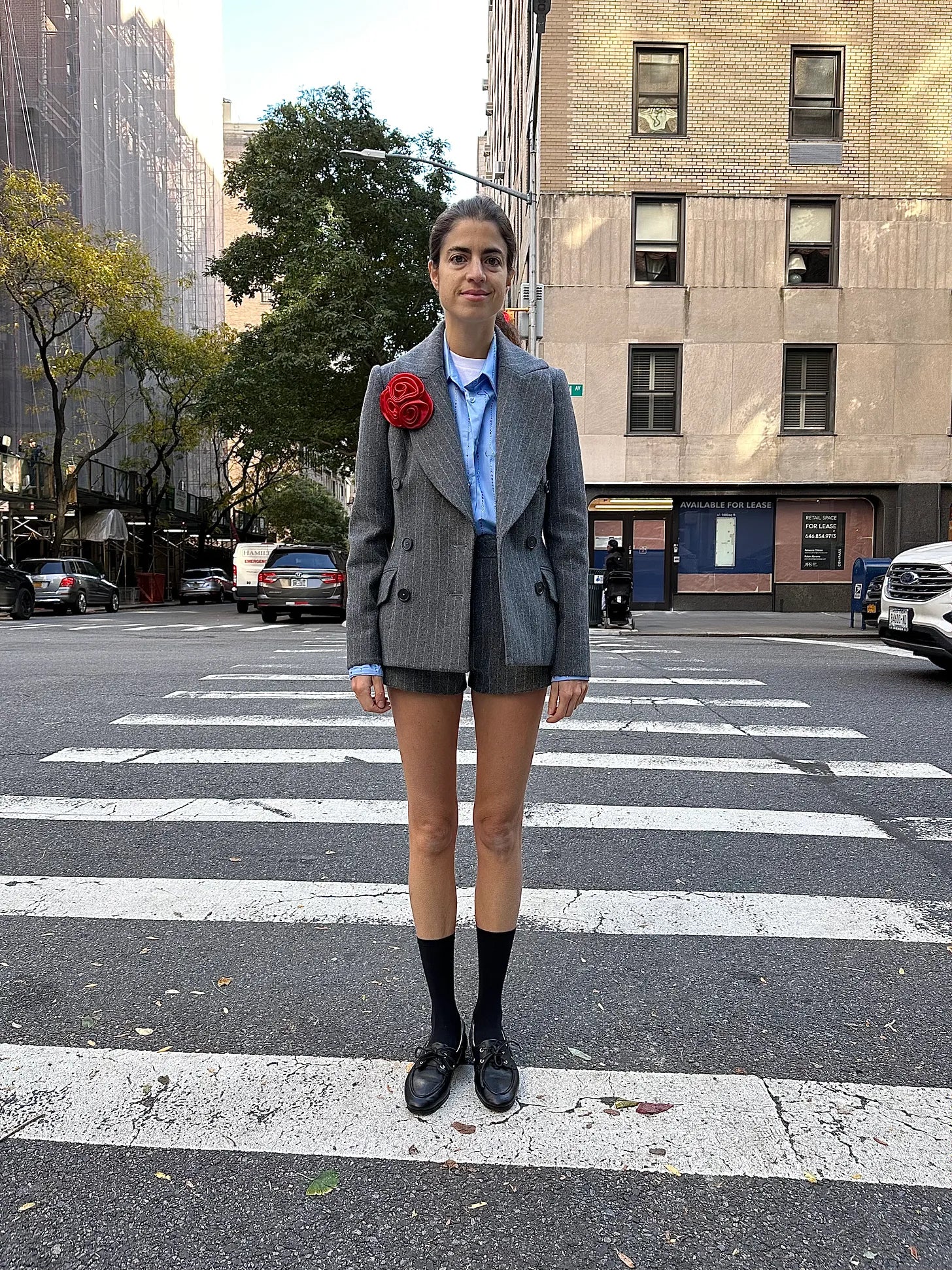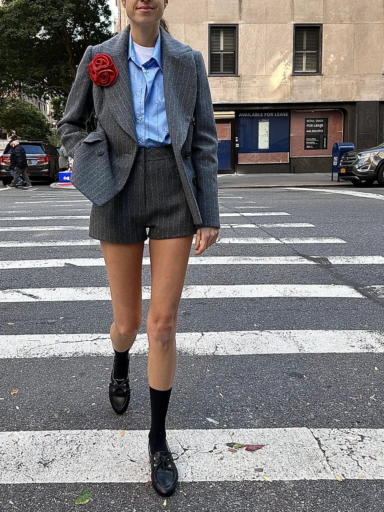 Not sure how many notes one needs more on the red rosette I have basically turned into an outfit tattoo by now but the one thing I’ll mention is that there’s something about how it interacts with the combination of this “mid-wash” shade of grey and blue shirt. They both bring to mind renderings of such a corporate outfit while the rosette carries a big corsage energy. Think prom or black tie party lapel pin. The balance just, idk, makes me laugh.