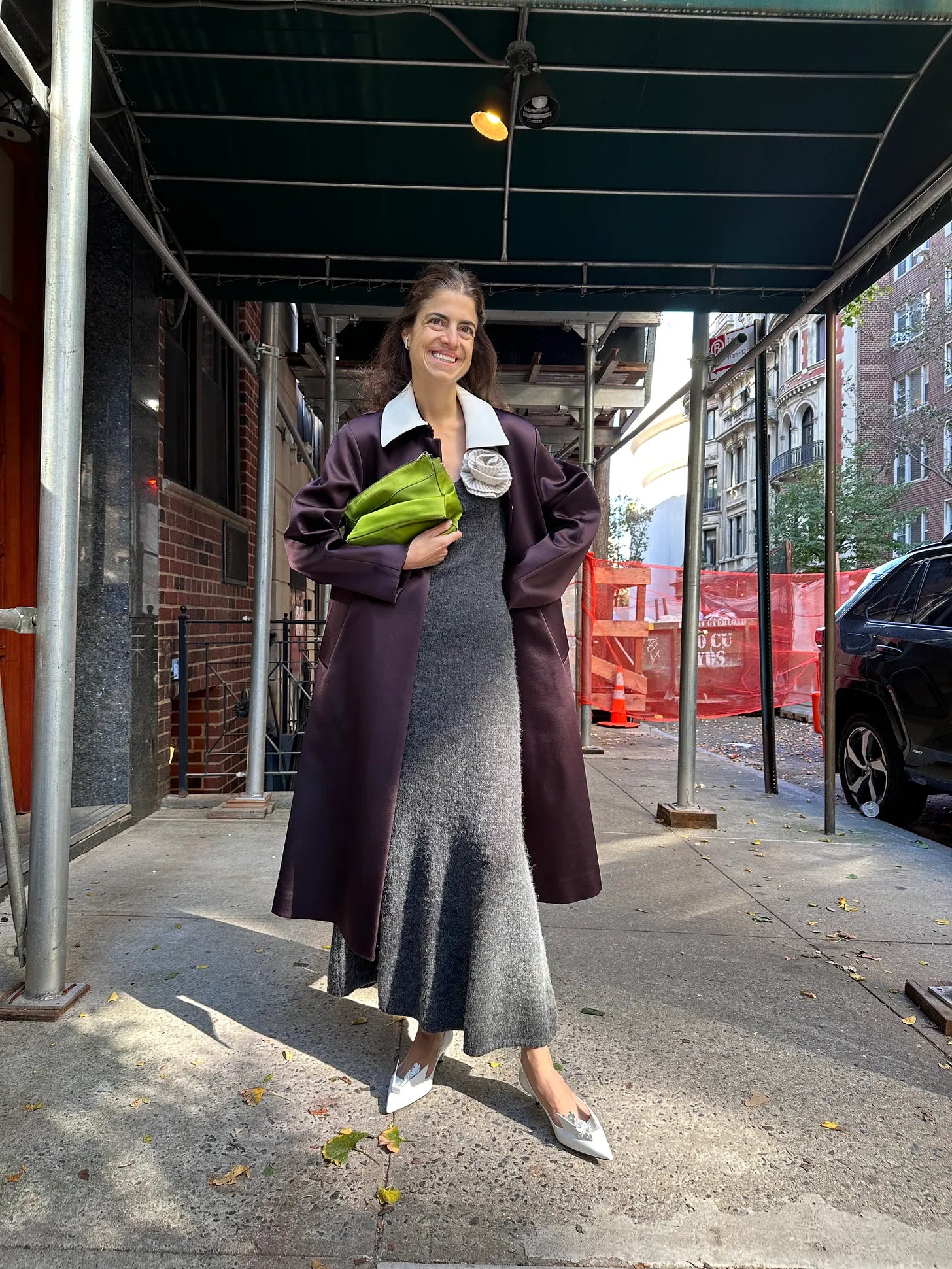 Tory Burch coat, The Garment dress, Prada heels (alt), The Row two-in-one satin pouch