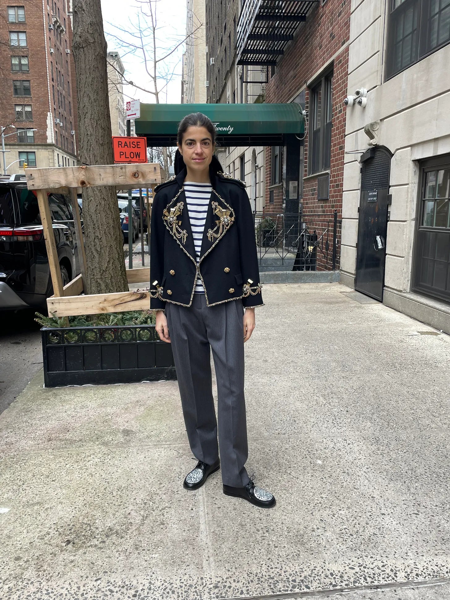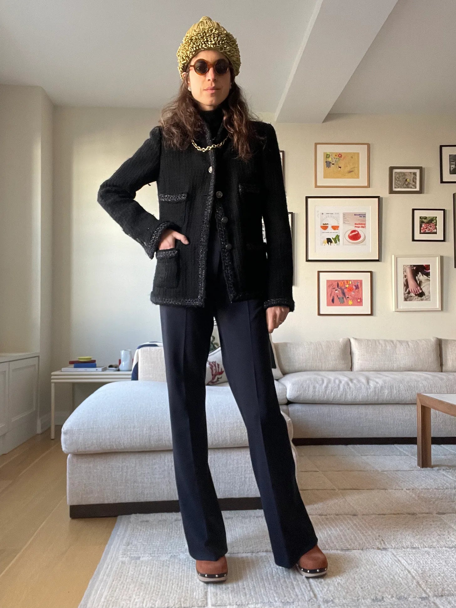 Chanel jacket (or), La Ligne striped shirt (but just got and rec this one if you’re looking for a rigid standalone), Emi Mess pants (like these from Sandro with an elastic waistband or these for a straighter fit), Loewe lace-up loafers but any pair of geriatric-ish shoes do the trick here. Like even these. Maybe especially these.