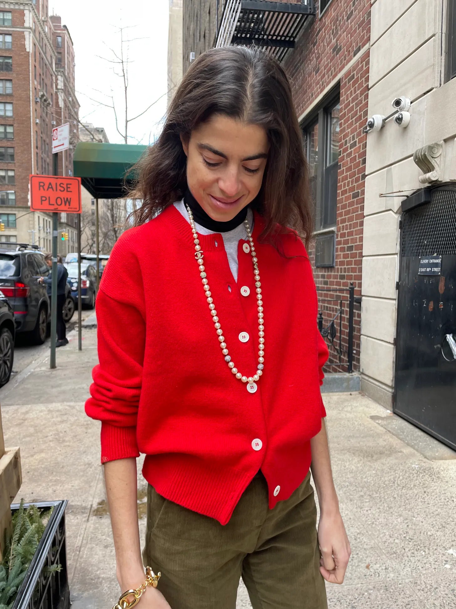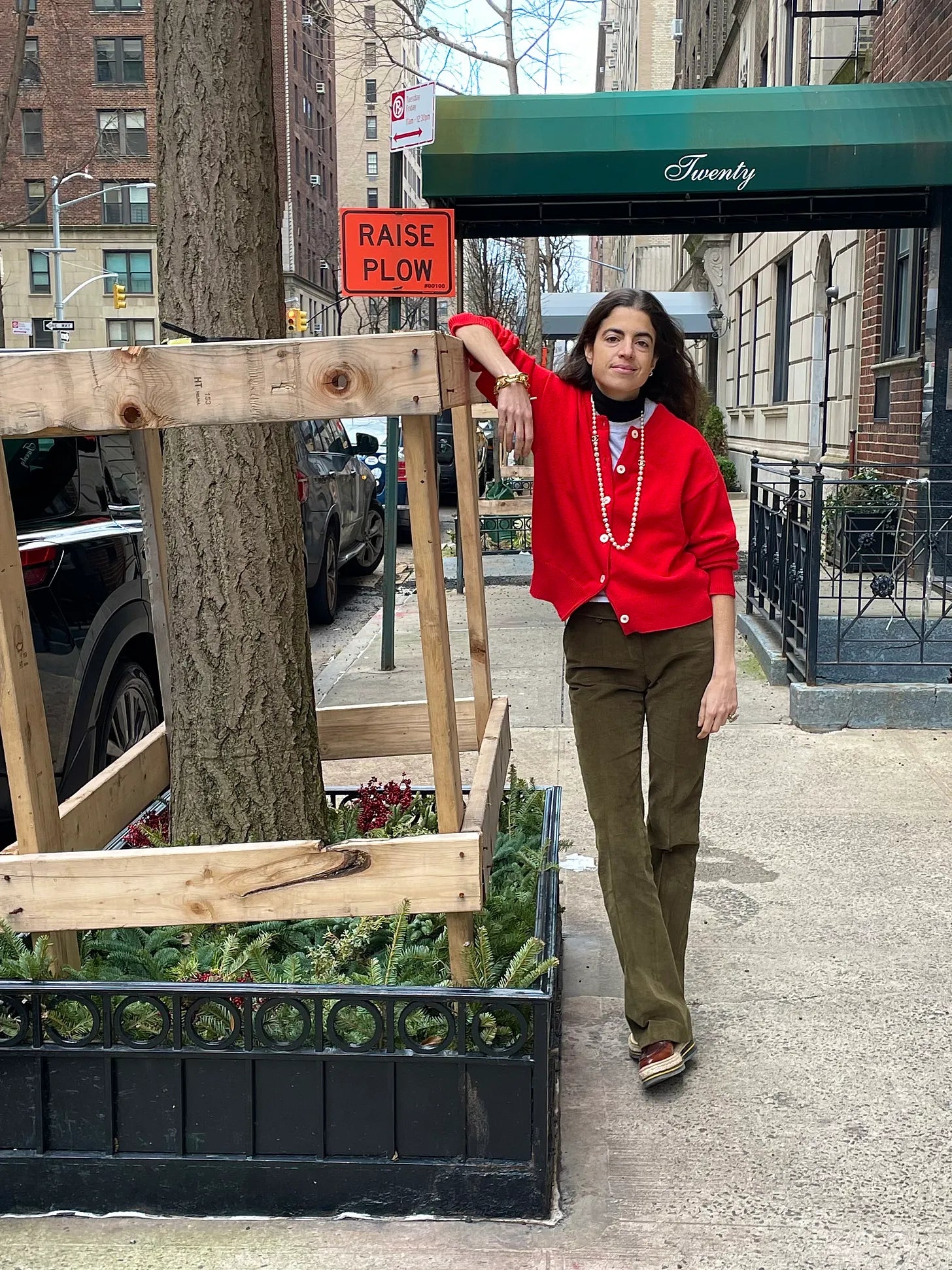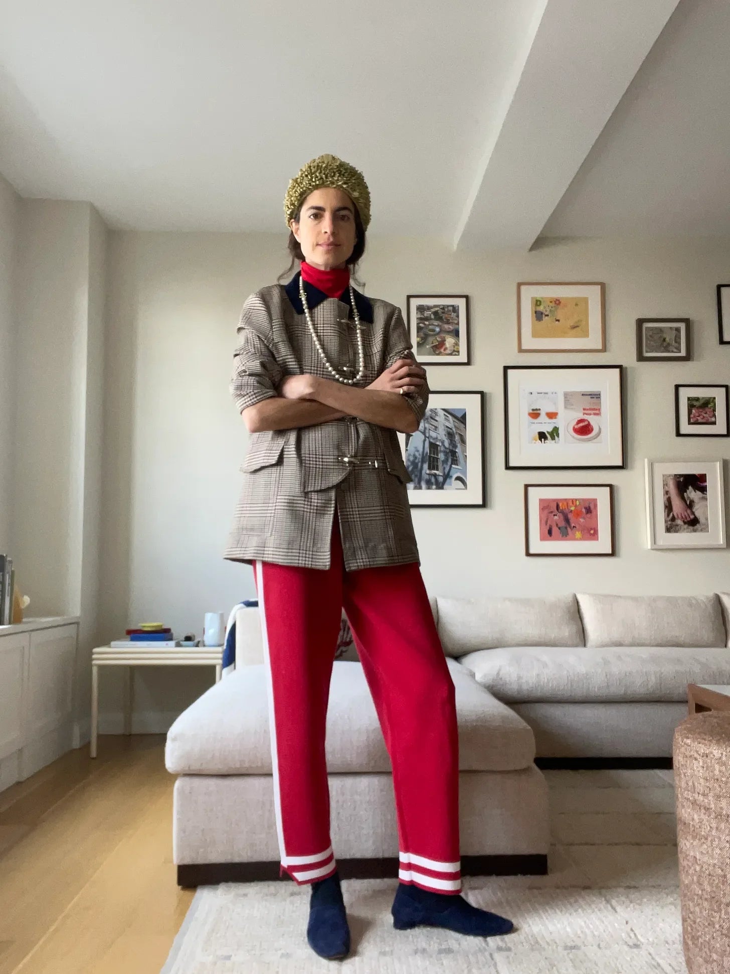 Jenny Walton hat, Ciao Lucia jacket, this is a good red turtleneck, Nagnata red pants, The Row navy blue loafers (if you like them and are a size 8, get this color; it’s basically denim blue so will work well with red, army green, striped, white — basically color you wear your true blue jeans with)