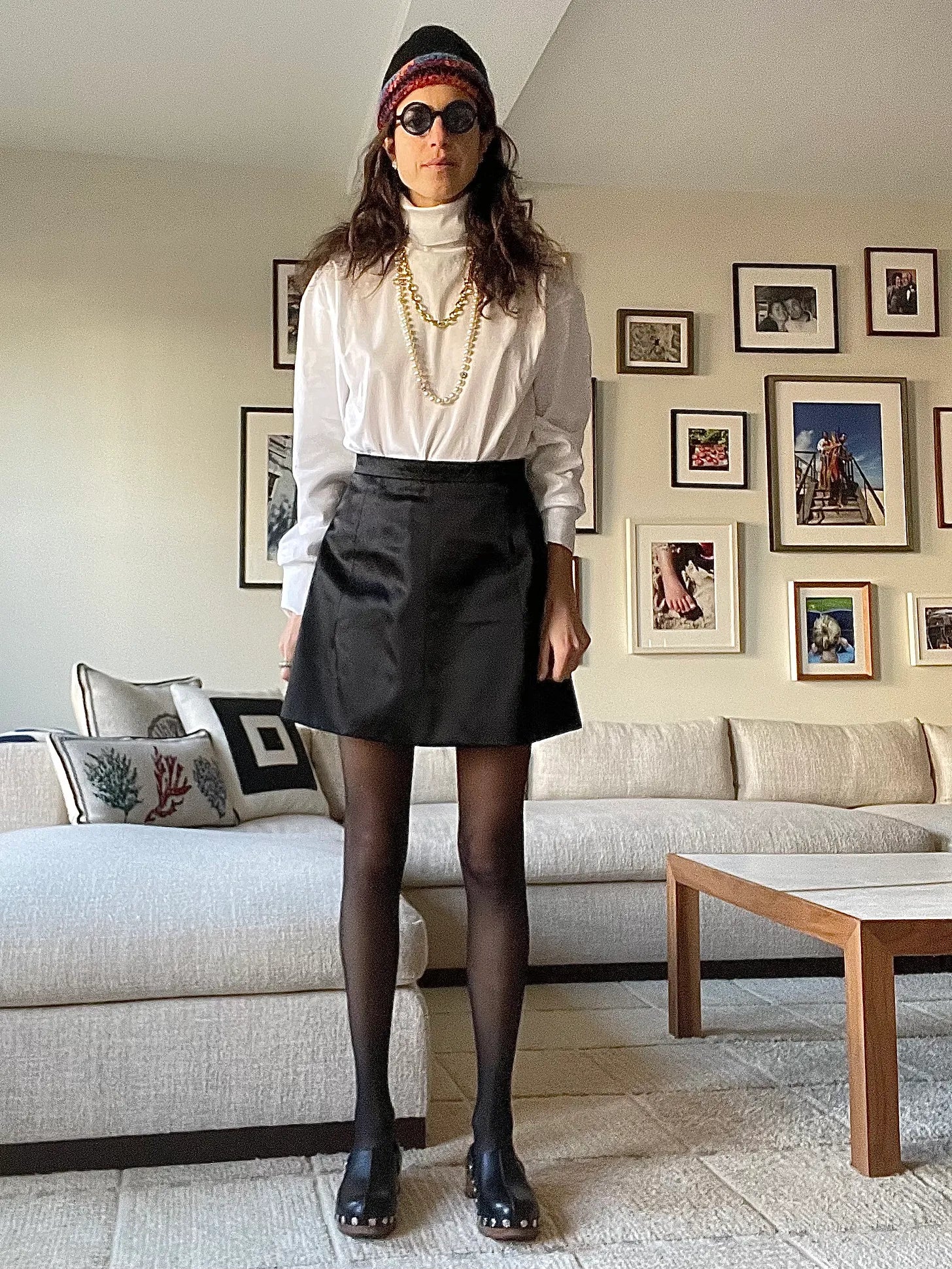 Carlota Cahis hat, Delarge sunglasses, more pearls 4 u, Patou skirt and I still do really like these groovy Khaite clogs (and these suede Paco Rabanne ones for $262 would be better with tights on account of the suede)