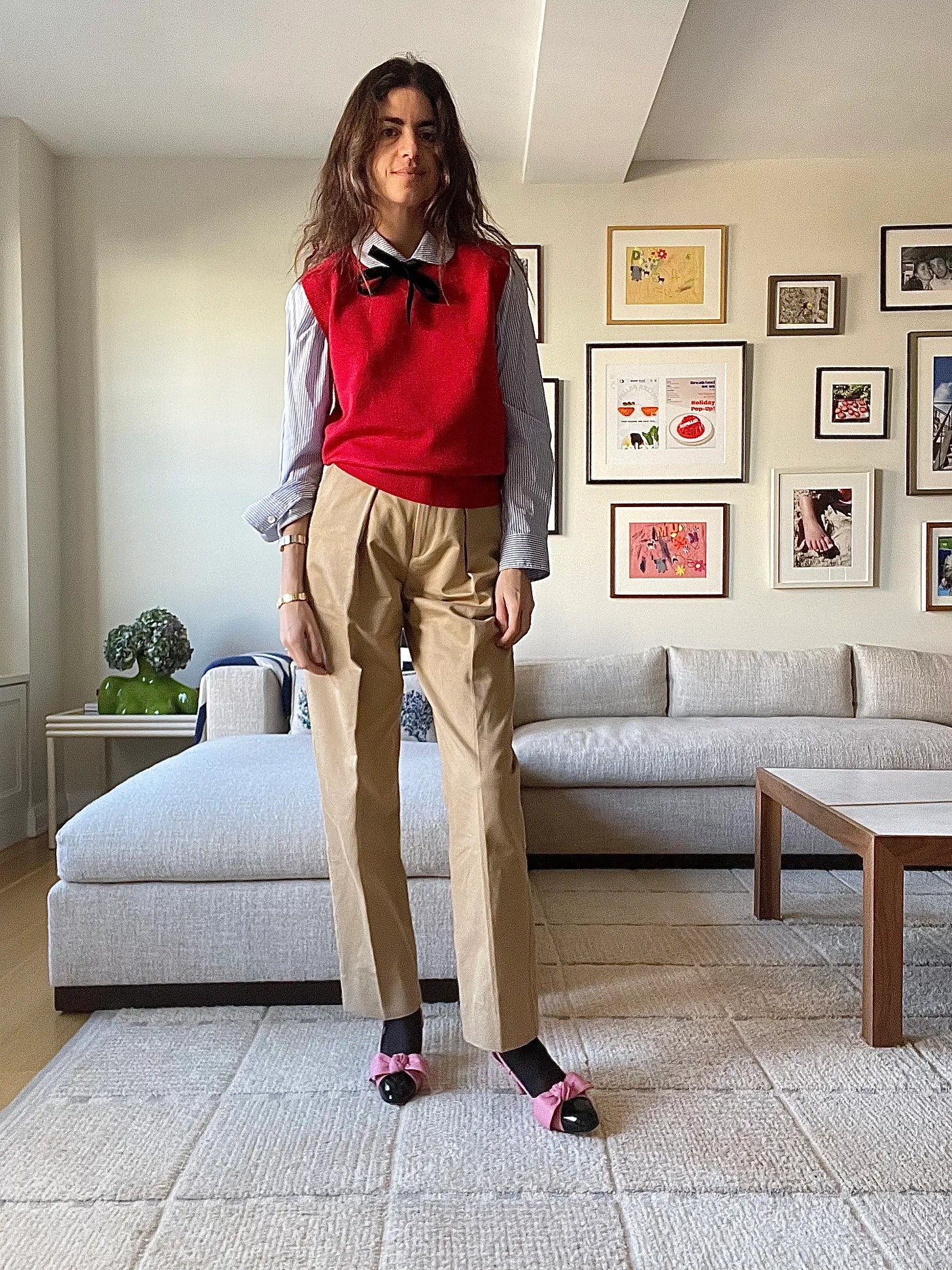 Big weird slacks! (Similar vibe.) Fun shoes and a mens v-neck by Maryam Nassir Zadeh (the long sleeve one looks great too)/shirt from Commes des Garcons. Very easy to replicate with a plain button down (peter pan collar or not) and some velvet string (like from wrapping or whatever)