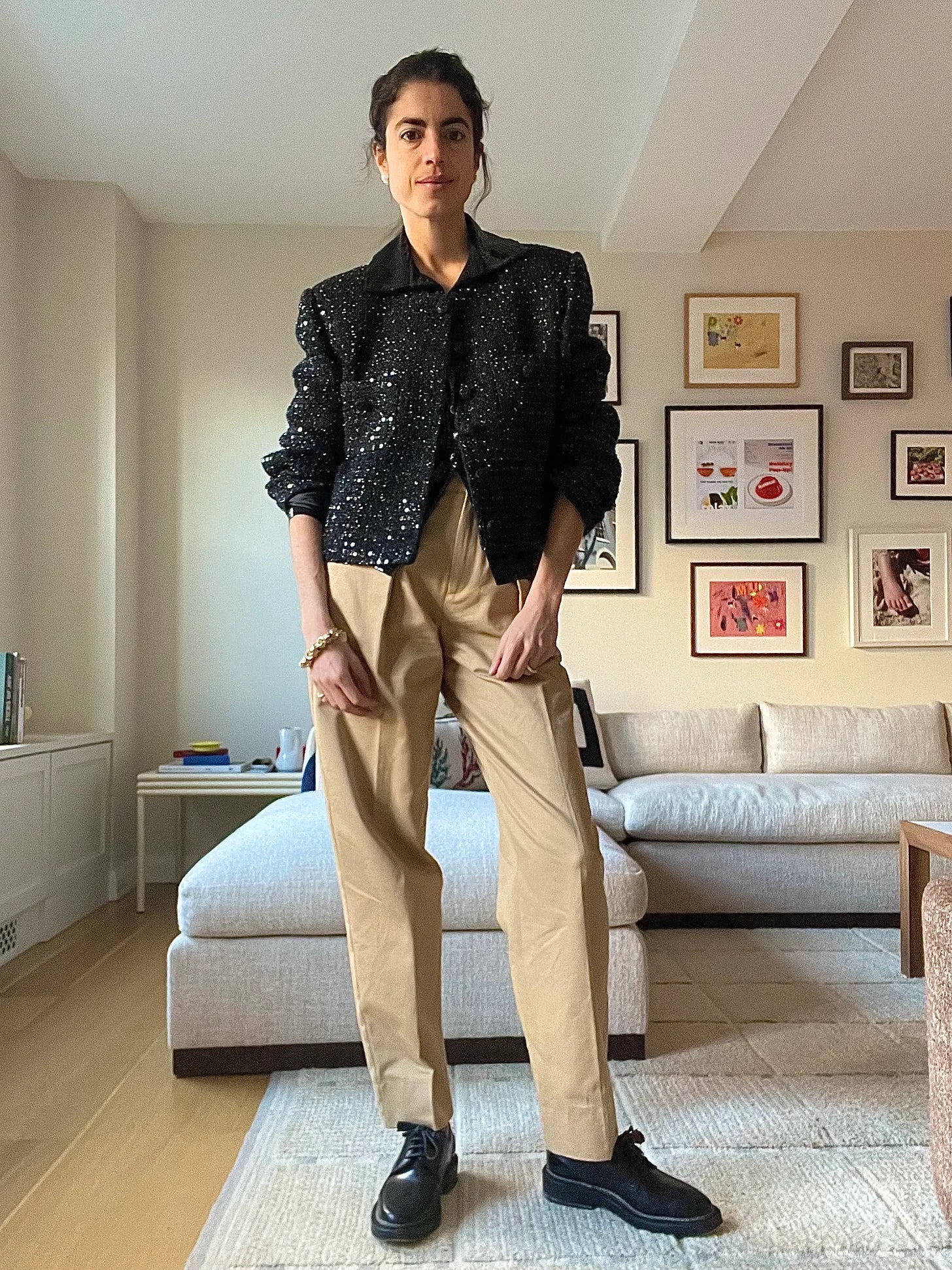 Siedres sequined shirt (surprisingly into this one from Elie Tahari), New Arrivals jacket (this one’s alert the media good), Soeur Paris khaki pants, The Row brogues (another very good Real Real find, the interior says “Fall 2014,” they must be from one of the first shoe launches)