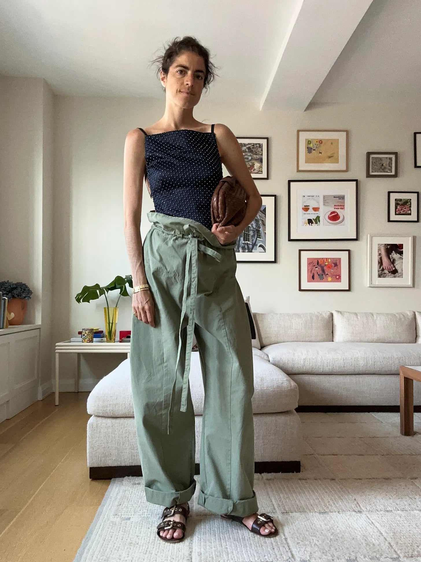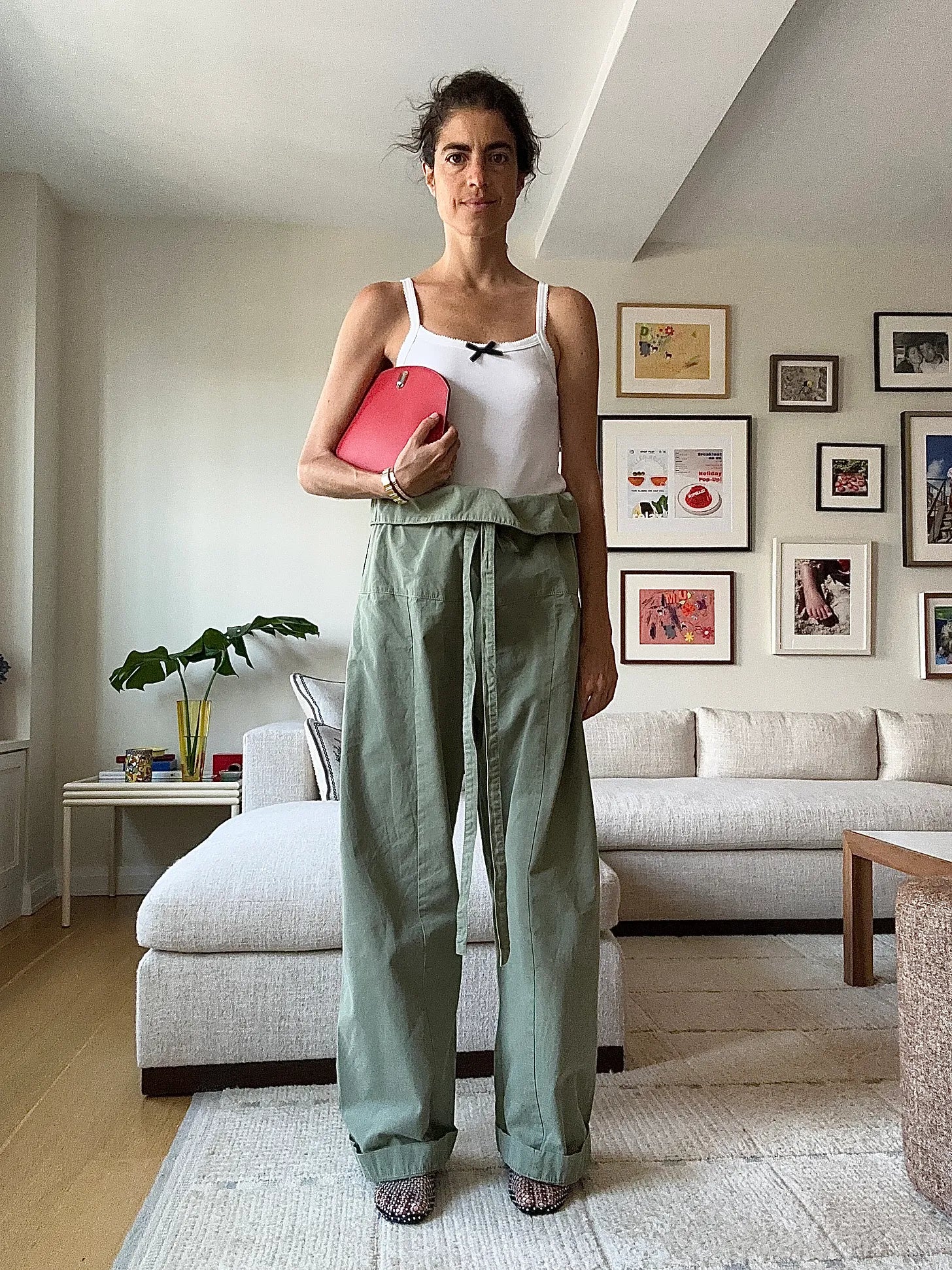 So the “baby hairs” you inherit postpartum never go away, huh? Caro Editions tank, Matteau green pants, Christopher Esber shoes, Savette bag
