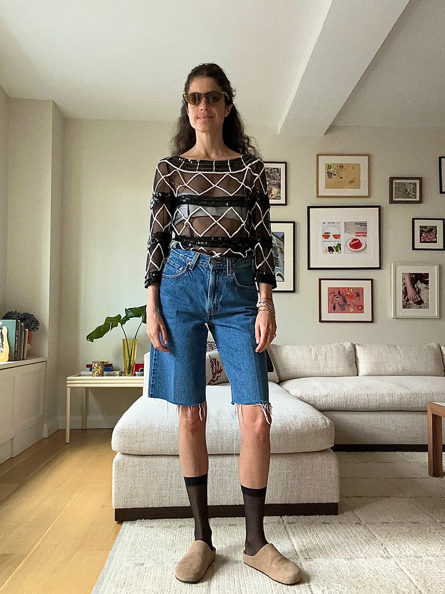 Khaite bra is the bridge in this one, styled under a vintage sequined top from The Real Real (one of us needs this leopard Dior polo for $168 but here r two potentially more practical alternatives) with Caro Editions shorts, Wolford socks and Jigsaw suede clogs. Raw footage of an actual outfit I wore to have dinner with my father-in-law.