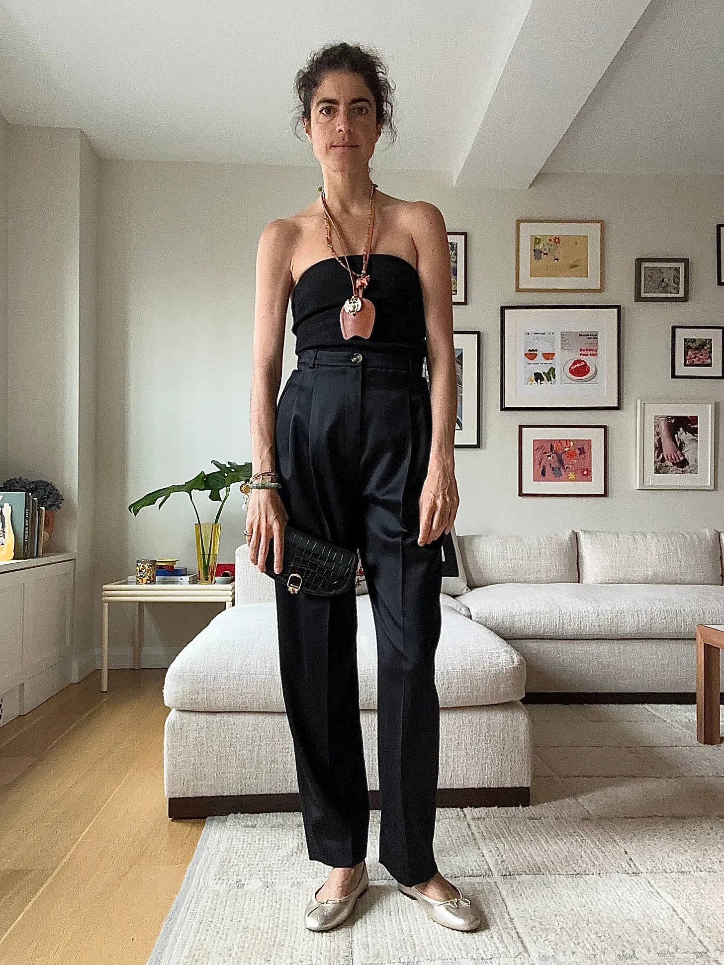 Any black tube top/bodysuit/swimsuit will do; Emi Mess trousers, French Sole ballet flats, Nili Lotan wallet clutch thing. A good bet for a leather cord to wear around your neck.