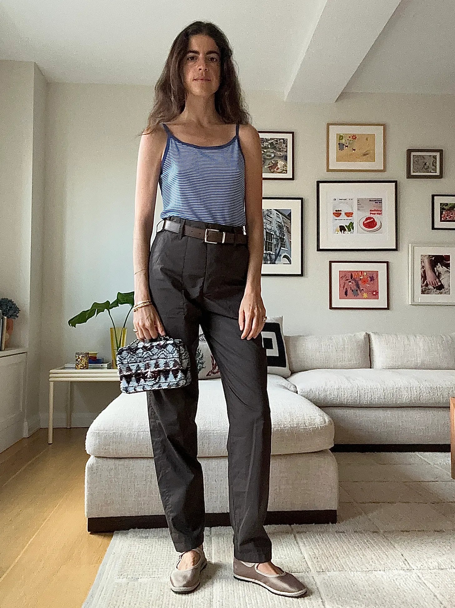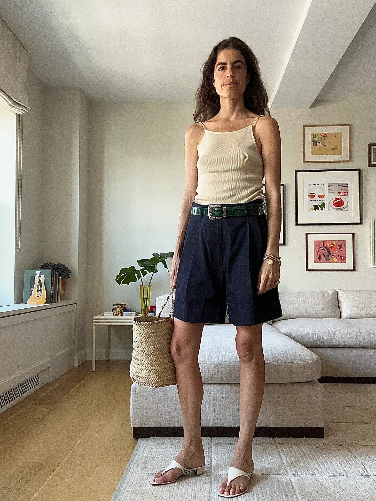 Item A. What to wear when you want to feel like your clothes are hugging you. This first credit is actually not a credit, but what a shoe! Would you wear them with tights. The tank is from a brand called Chance that doesn’t exist anymore; here is a darker blue striped thing in its place, Beaufille belt, Maria McManus pants (another such hero of the season, right next to these yellow shorts, on account of fit and lightweightiness), Cayumas x Cafe Leandra mary janes