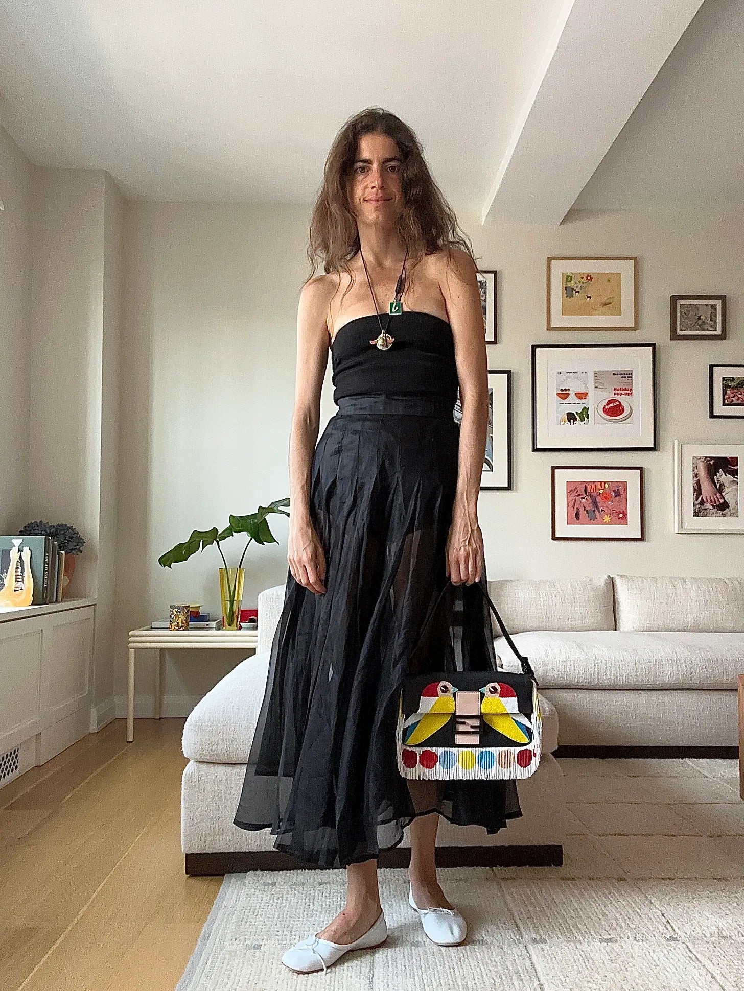 Here’s a great comp for the bag — I’m wearing a plain black swimsuit and A.W.A.K.E Mode skirt from a few years ago (this is nice; the current stocked-on-the-big-platforms version of it is this but if you’re going the way of a straight skirt, maybe this Prada number from Resee is more appealing to you) with Jamie Haller ballet flats. They are pretty in this new shade of gold too