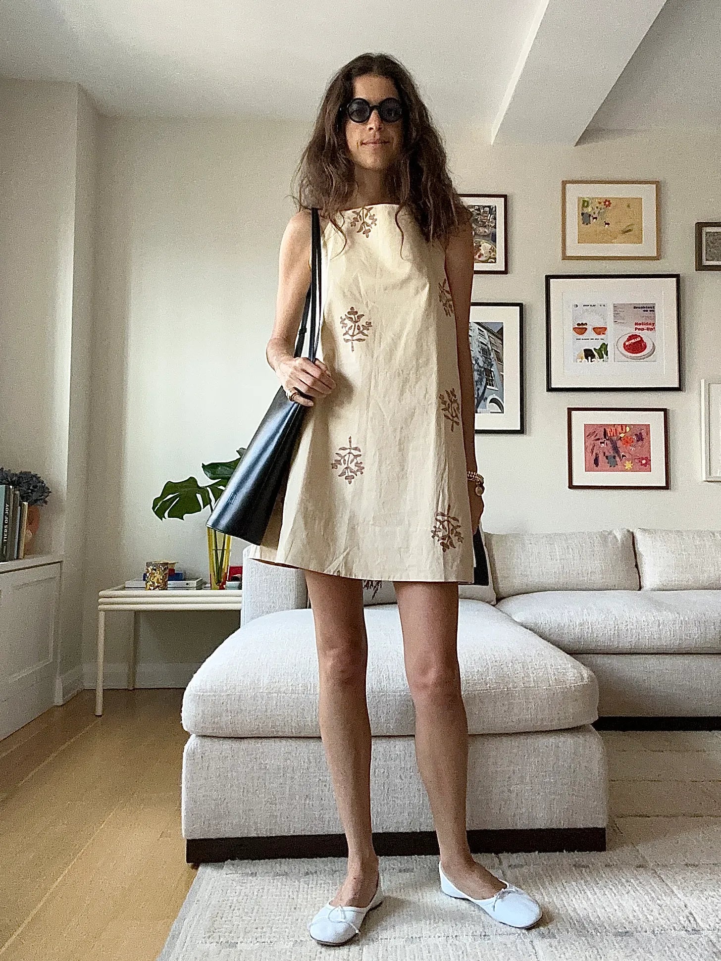 Creative license taken with the toss-off garment as more like a toss-off print. Soeur mini dress, By Malene Birger wine bag. Jamie Haller ballet flats