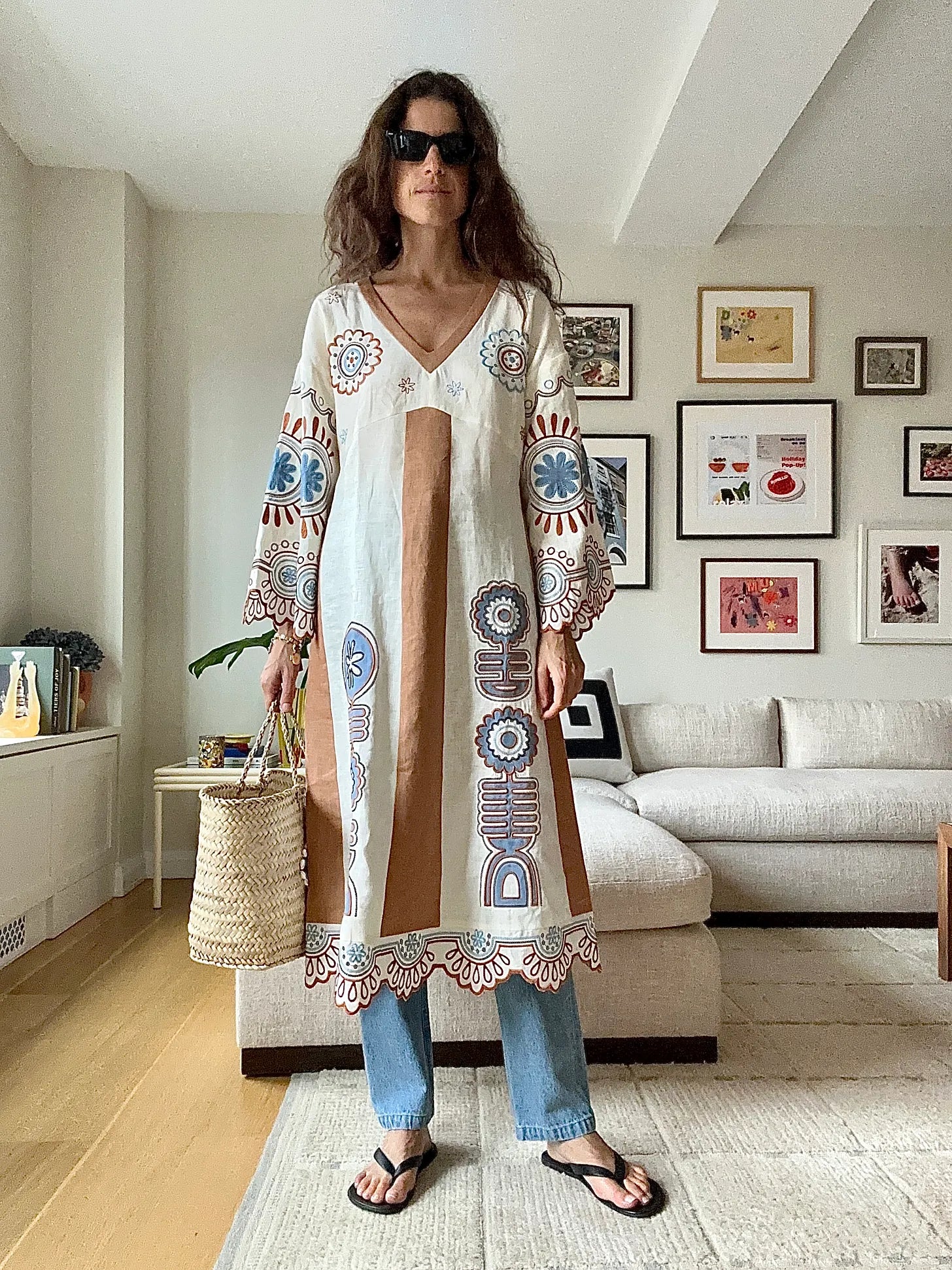 Part 2 from the series I’m Going to the Farmer’s Market but Just for A Walk. Etnodium dress, Giuliva Heritage jeans, Havaianas flip flops, Blooming Dreamer bag. Think I mentioned this last week in post but it turns out the ideal-sized bag is about 1/4th narrower than a classic LL Bean tote and maybe an inch or two longer.