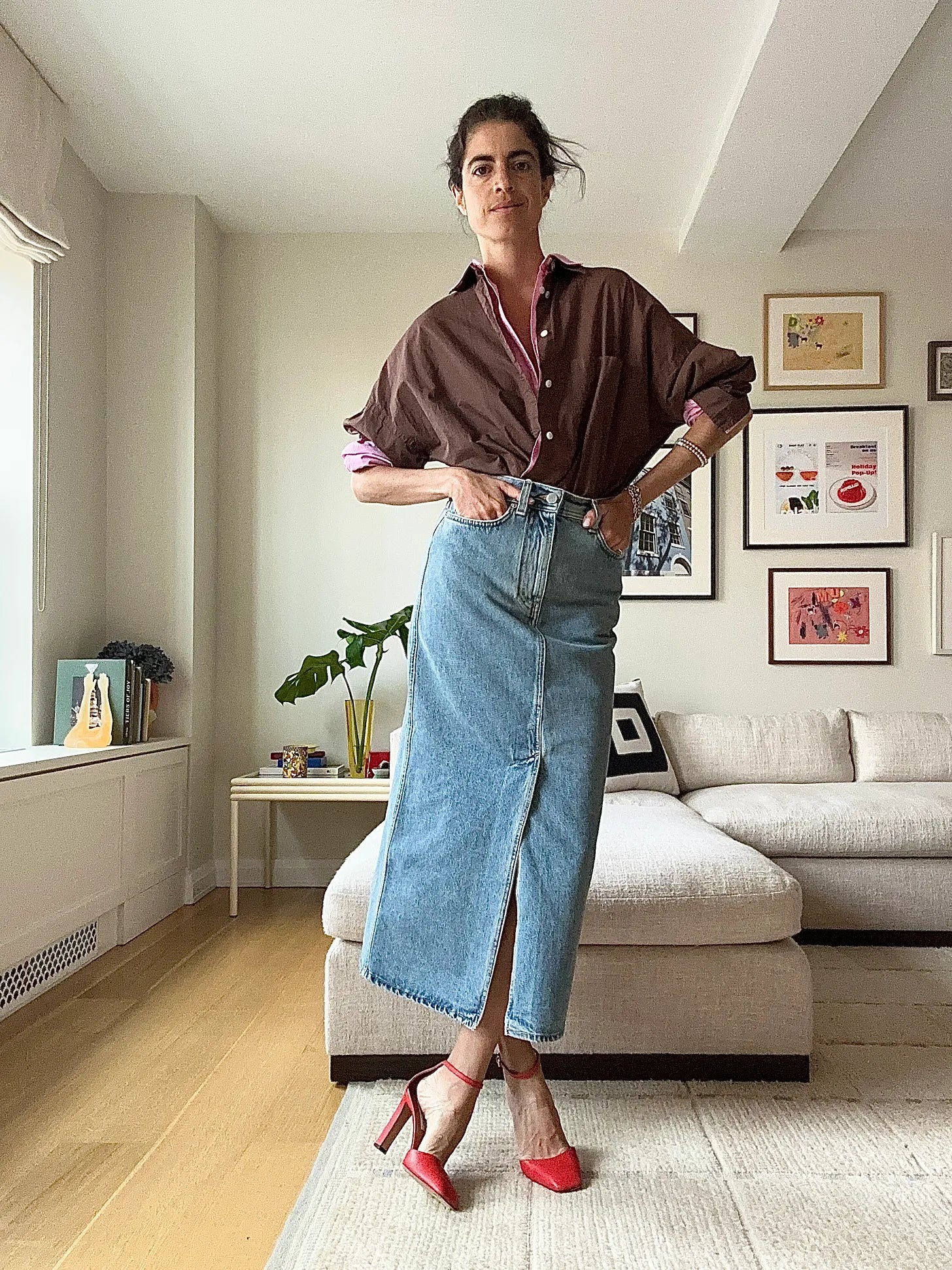 This is the look I made to remain consistent in the toss-off (with the pink LMND shirt styled under the brown one the Bottega way), but the real one that got me, as a former Yeshiva day school student, excited about interpreting this skirt a new way was: