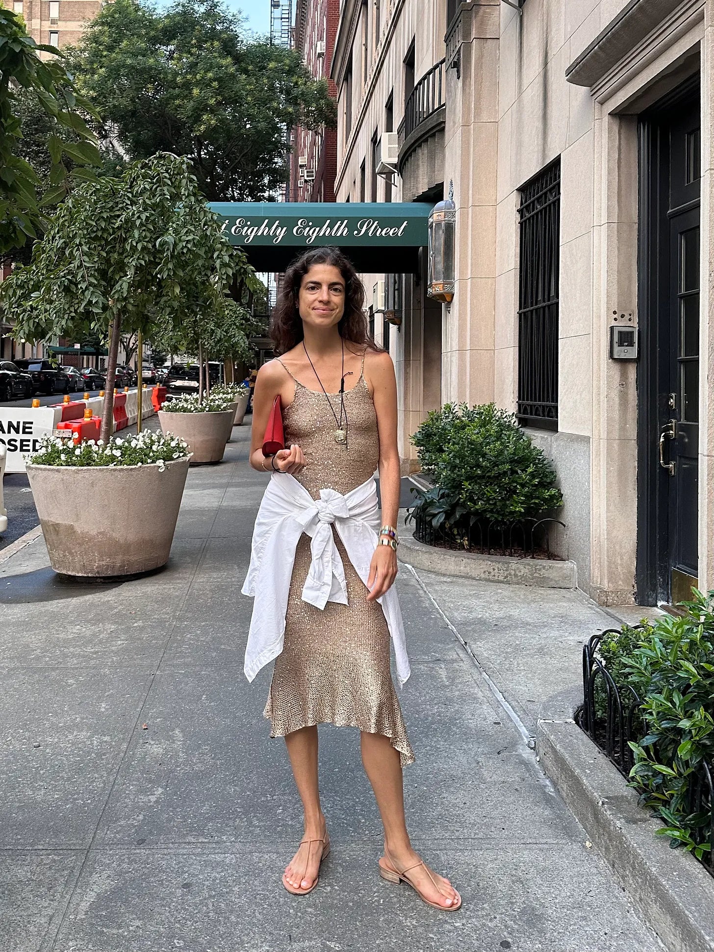 Maison Cleo dress, Ancient Greek Sandals. Our bridge is the necklace! A great look for date night. The shirt-around-waist doubles as a belt for the kind of occasion when you’ve been constipated for days but can’t not wear the dress