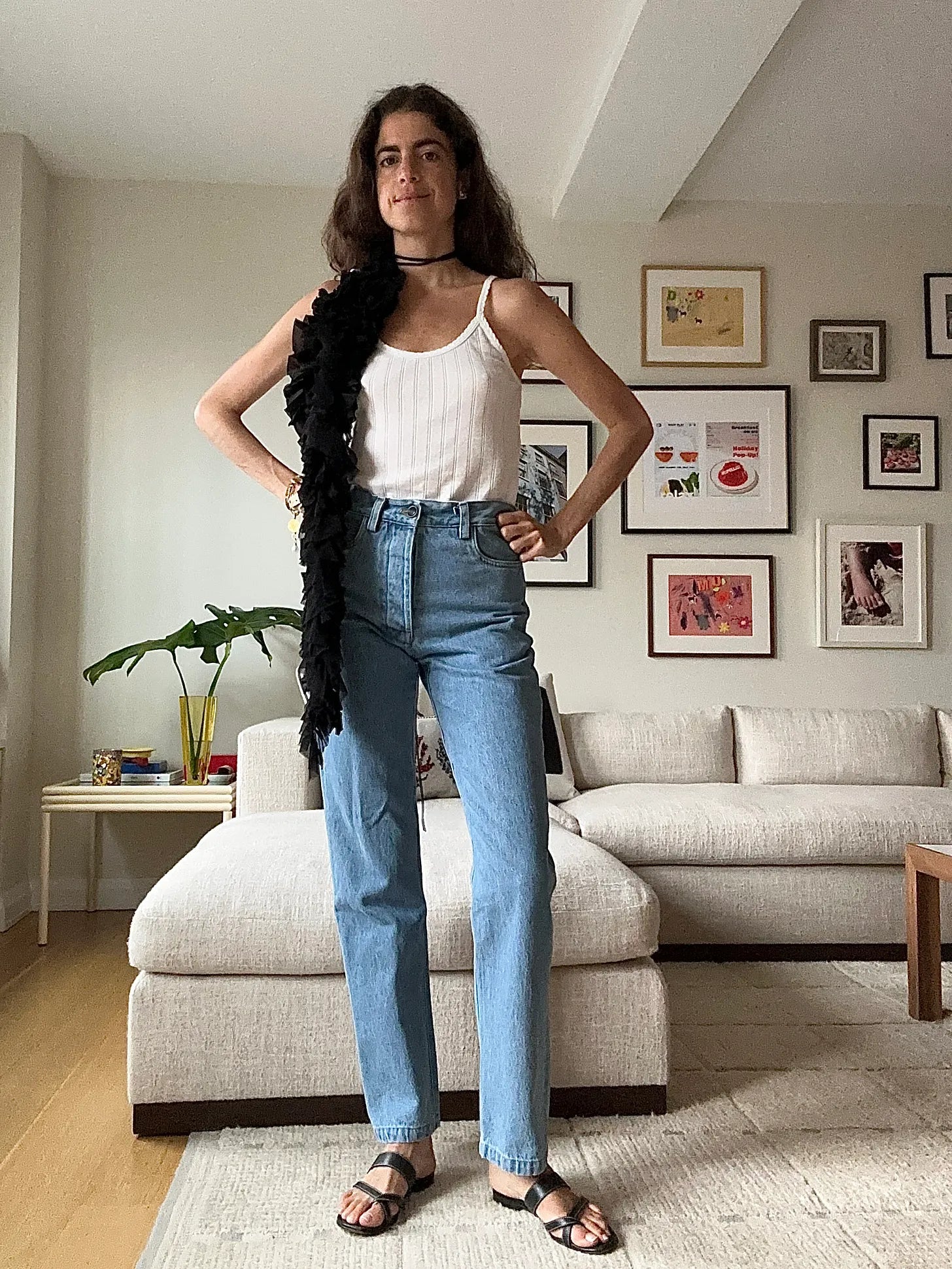 Dries floral choker (hold on what’s this?) — it seems so impractical and is annoying to store, but I actually wear it pretty often, Leset tank top, Giuliva Heritage jeans, Manolo Blahnik sandals