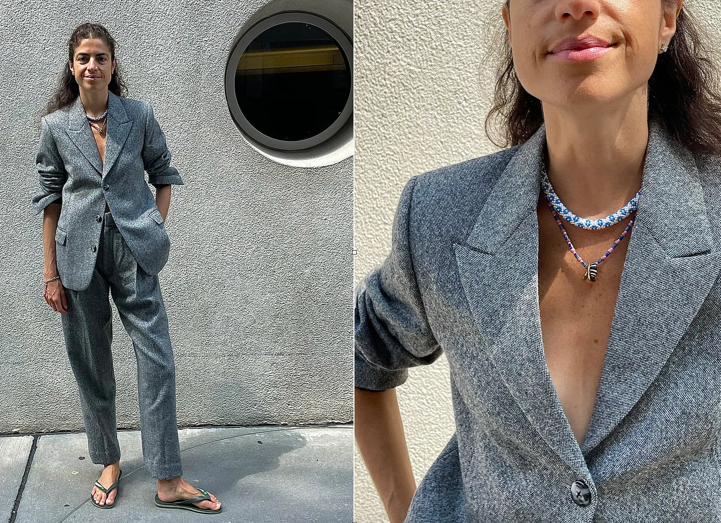 Bouguessa suit — and the necklaces are from Roxanne Assoulin (blue and white tube) and Blooming Dreamer — it’s a shell on there but I strung my gold pinky ring through it, too.