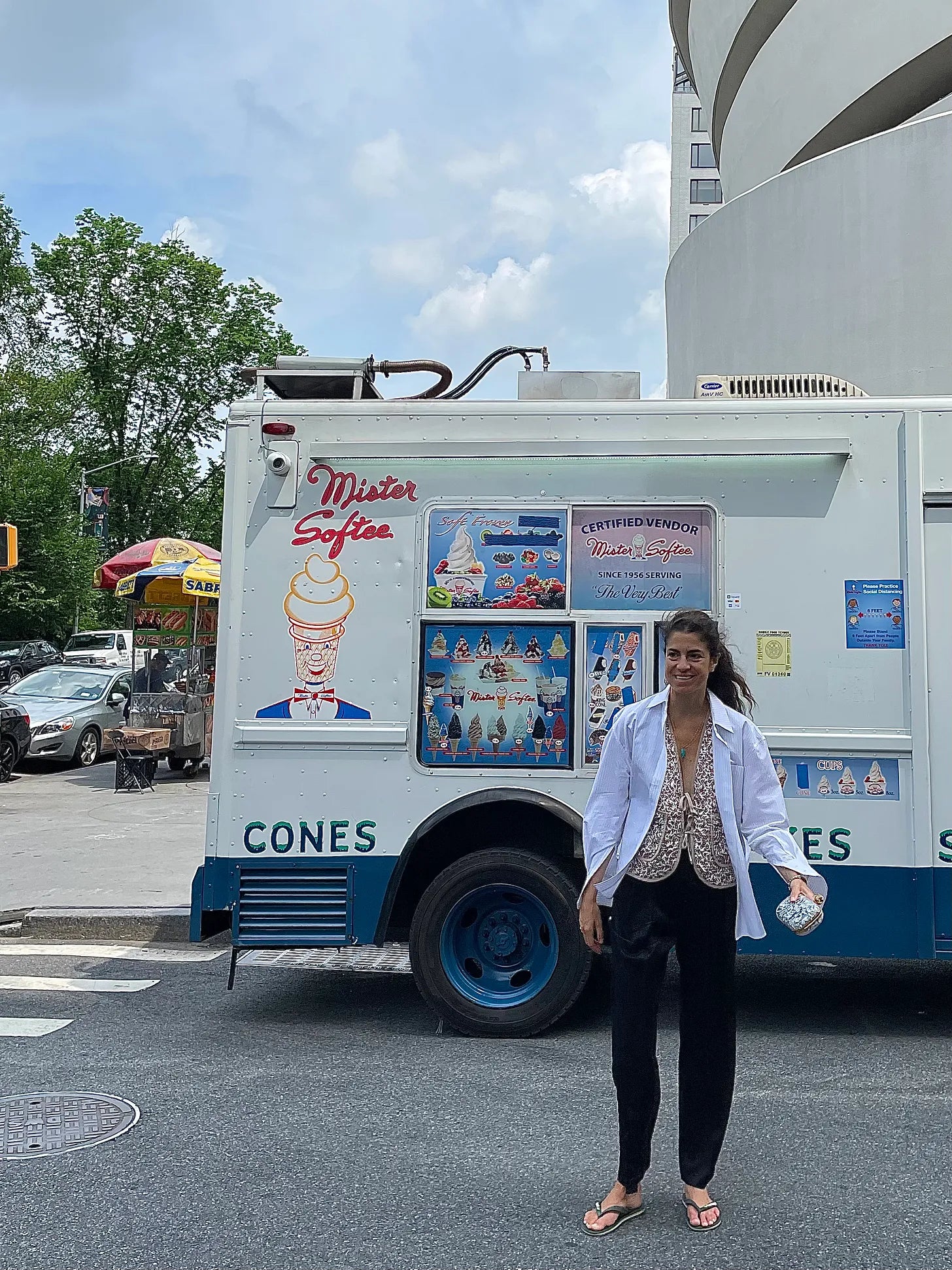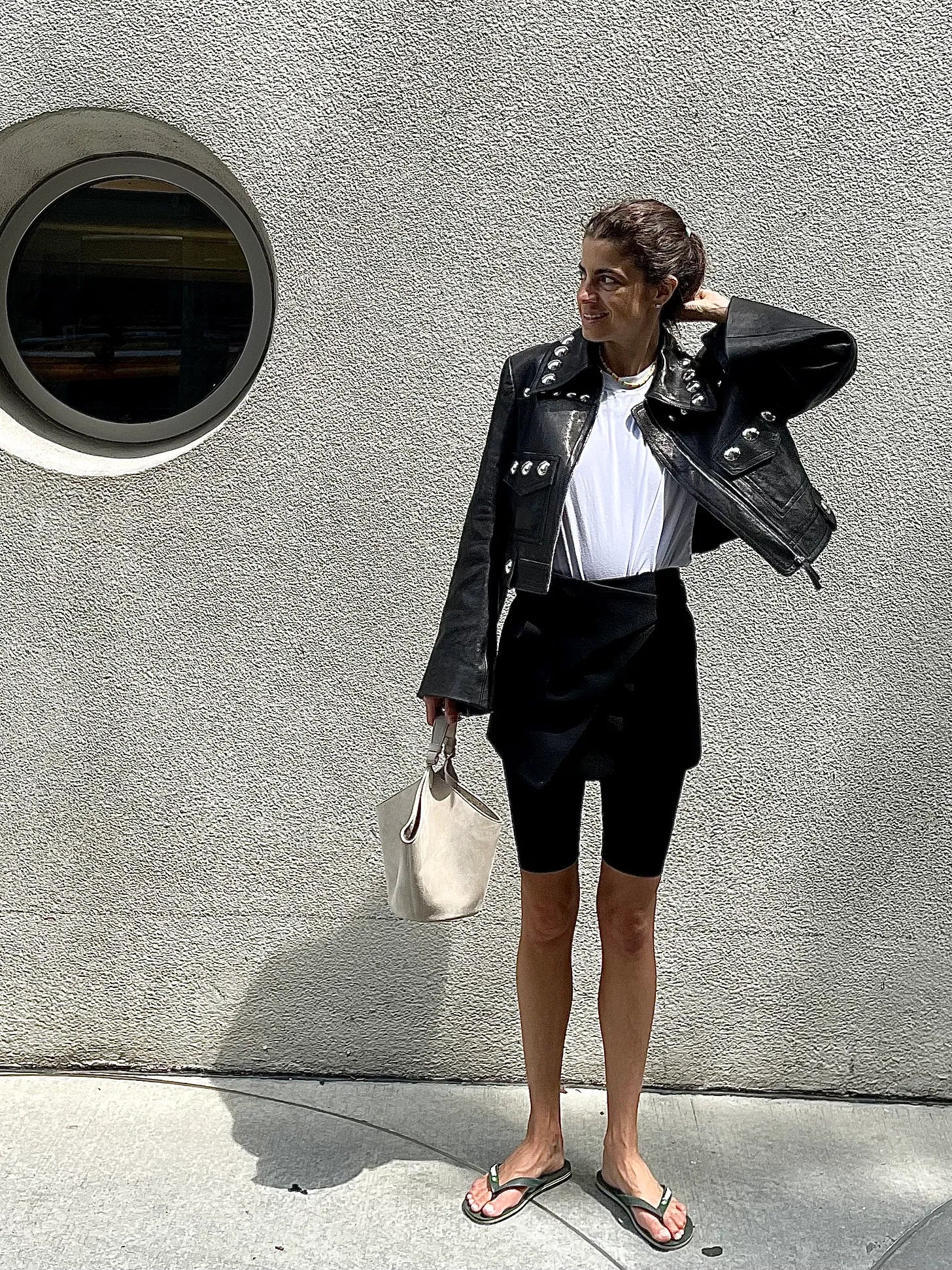 Khaite jacket and bag (it has turned out to be a great everyday-er in spite of its beige suede nature), Jeanerica white t-shirt, Wardrobe.nyc skirt, Maria McManus bike shorts and, of course, le flip flops.