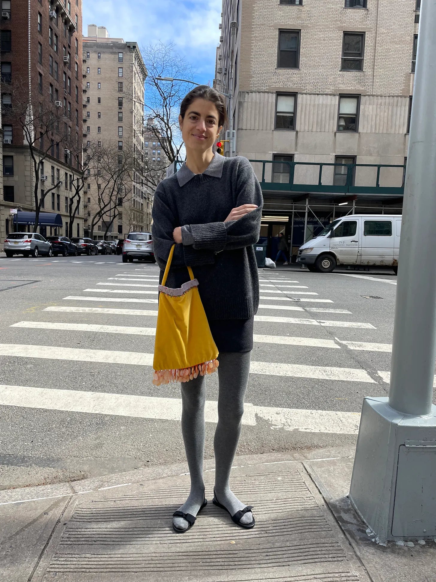 Venstore polo and sweater, Mango skirt, Calzedonia tights, The Row sandals and this bag is from a store in Ibiza called La Galeria Elefante (this weird thing from Etsy evokes the same spirit; and I loooove this one)