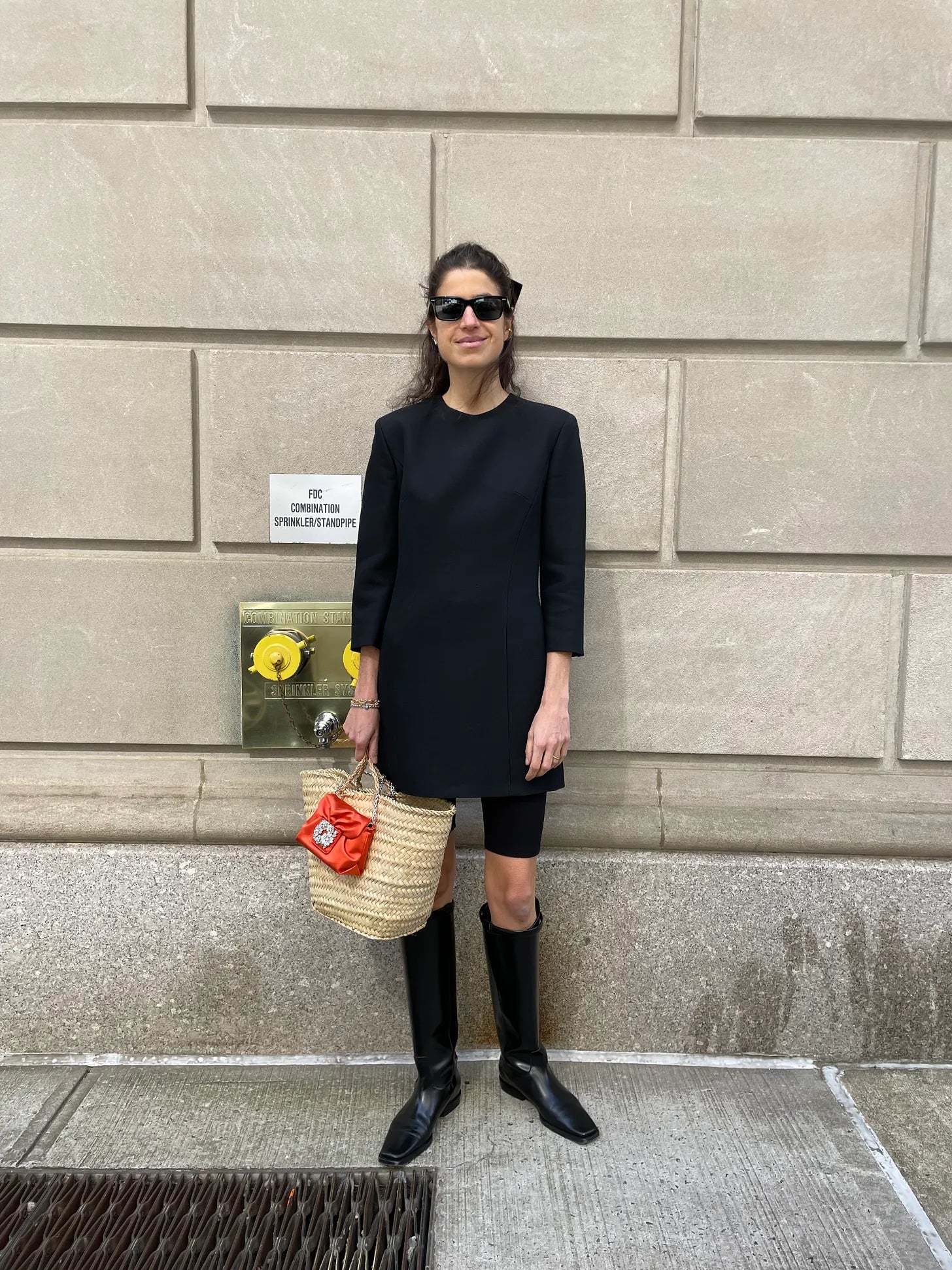 Veronica de Piante dress, Maria McManus shorts, Toteme boots, Blooming Dreamer straw basket, Roger Vivier satin clutch (smaller than it seems, can’t even fit a phone! So many (!) good non-designer ones here too…)