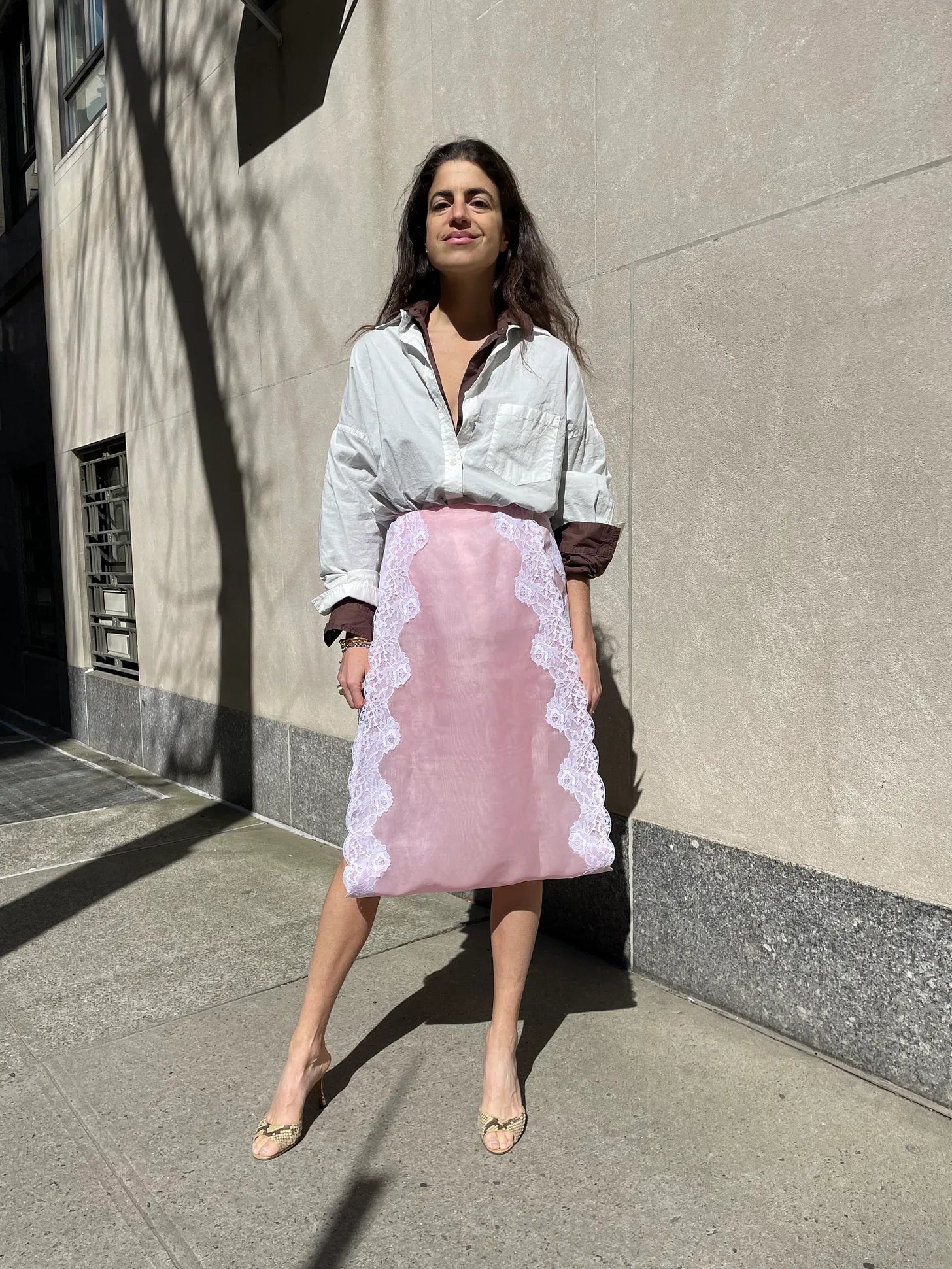 This! LMND shirts x 2 (here’s a lighter shade of the brown; the shirt style is called “Chiara” and there are tons of colors, so choose your own adventure), Christopher Kane skirt, Manolo Blahnik mules (these could do the job w a neutral skirt; I like these from TRR too)