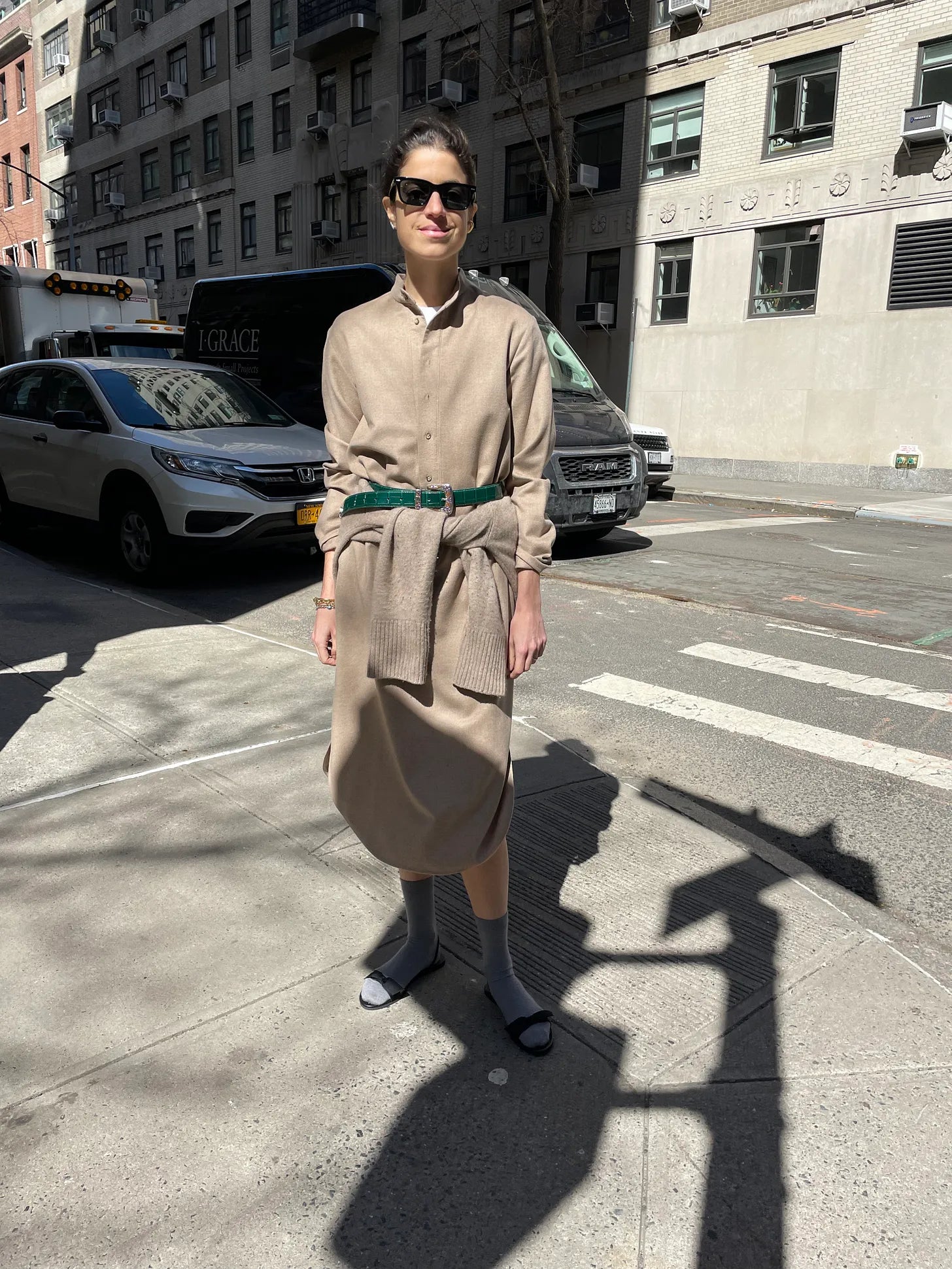 Attersee caftan, Sable World belt, Venstore sweater, Falke socks and sandals and sunglasses from The Row