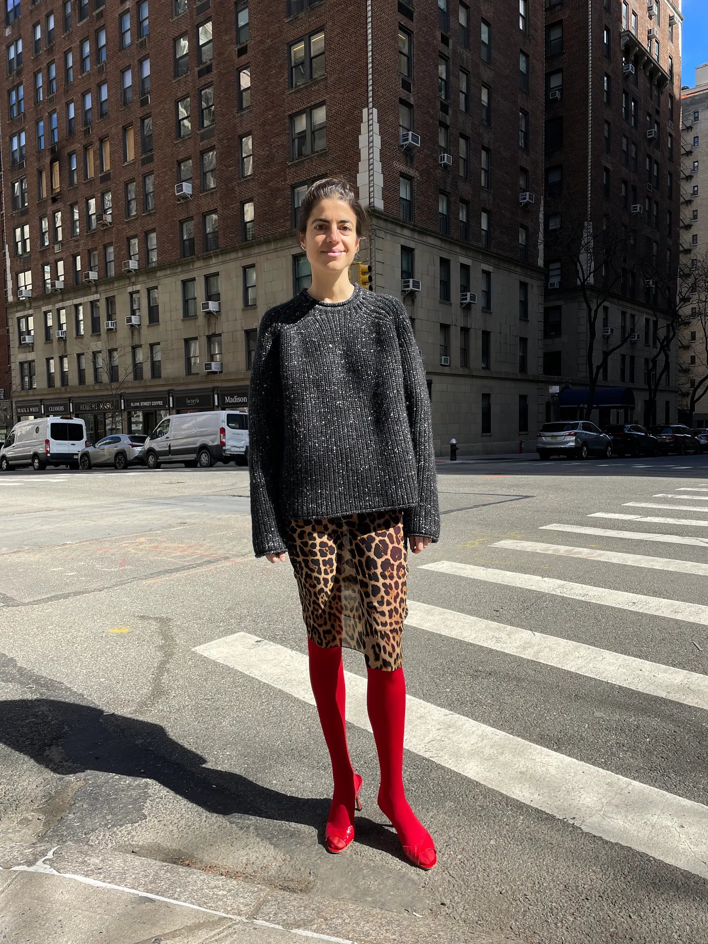Consider it a primer for next week’s full-blown analysis of whether leopard print is coming back, whether it can even ever actually do that (does leopard print go out of fashion?), and how to wear it in spite of the above without feeling like you’re in leopard! print!. I’m wearing a Toteme fisherman sweater here, a skirt from Saint Laurent (a real leopard slip would work just as well), tights from Calzedonia (which have since sold out, but I really like these too) and Manolo Blahnik mules I found on The Real Real one night while I was breastfeeding. Most of the shoes I still own, I think, I bought on TRR while I was breastfeeding.