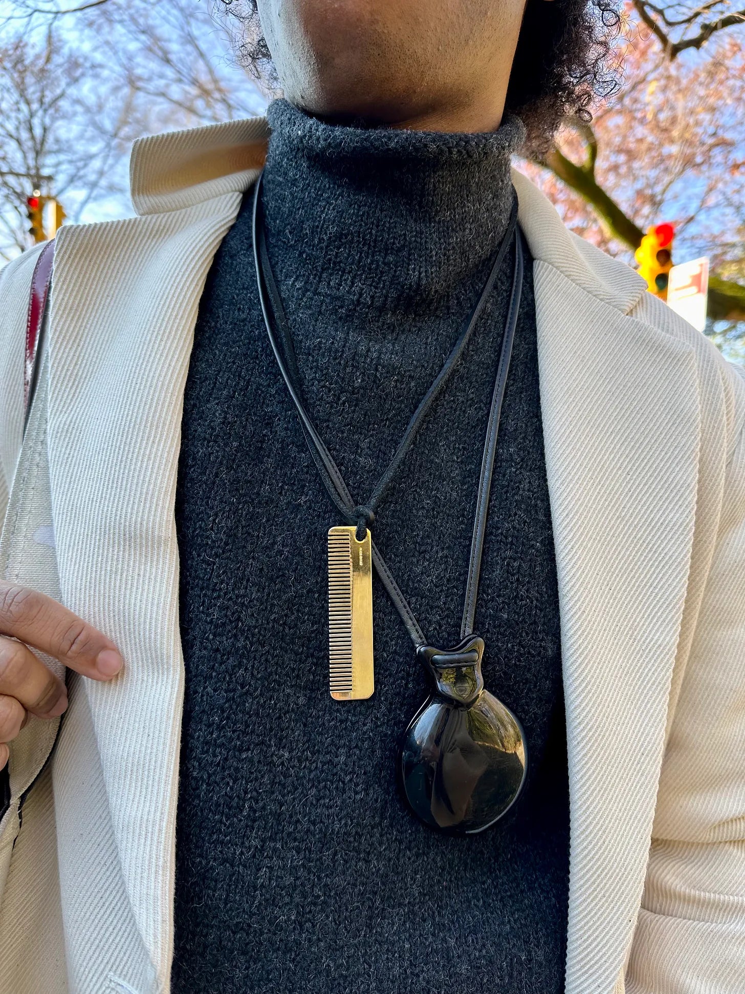 Judith Lieber gold comb strung through black shoe lace, Lemaire compact necklace (see also: the flask!)