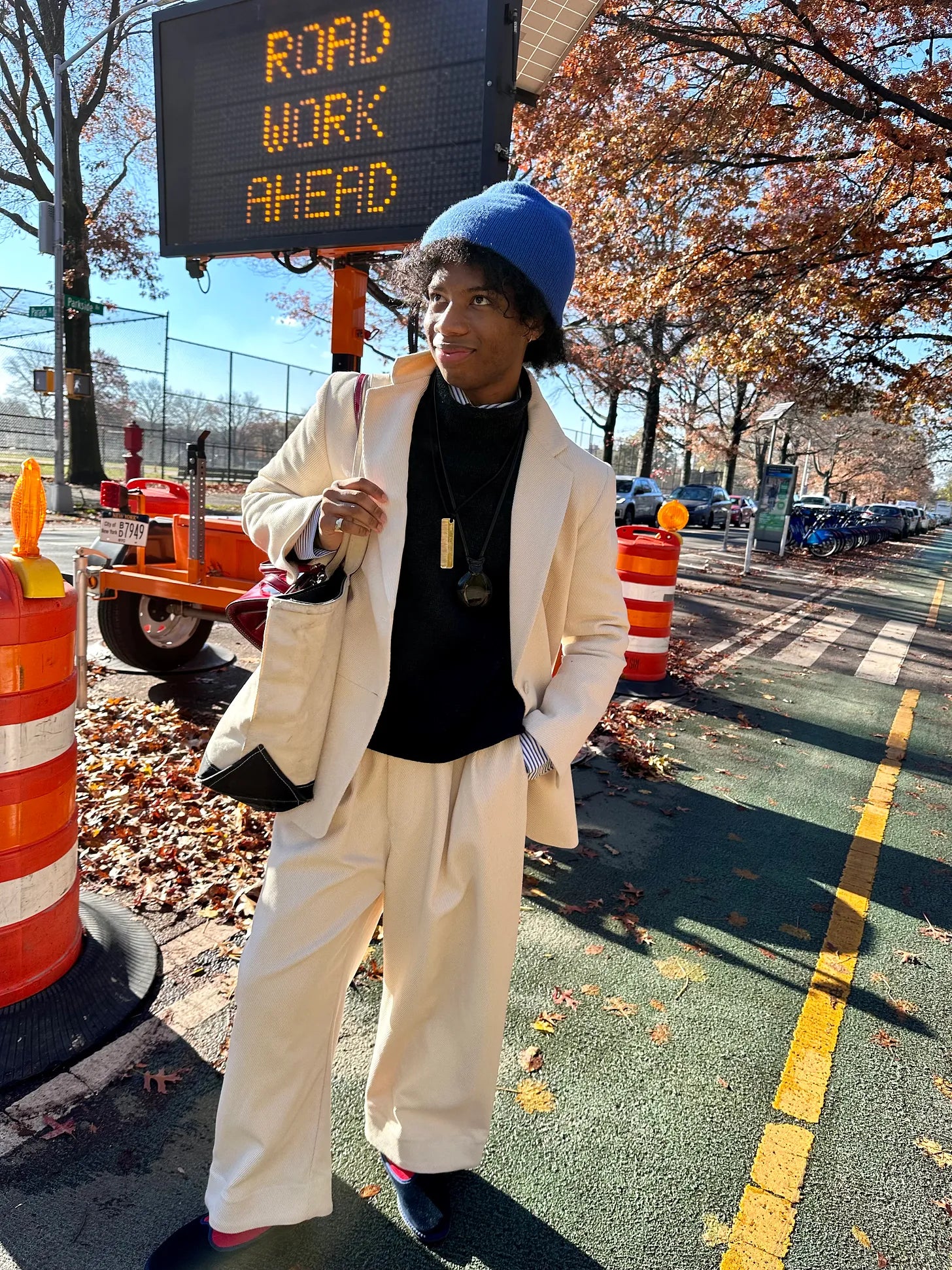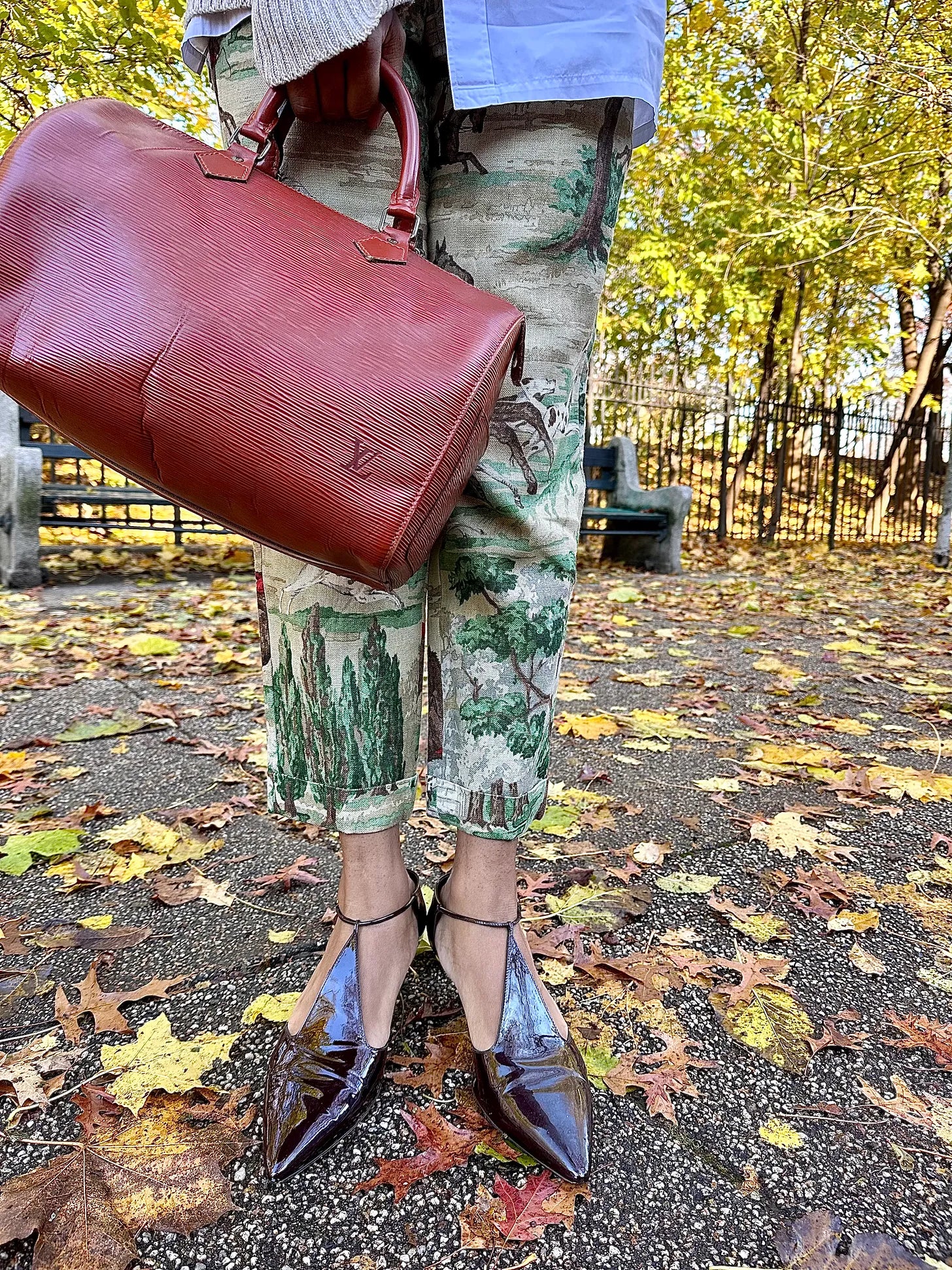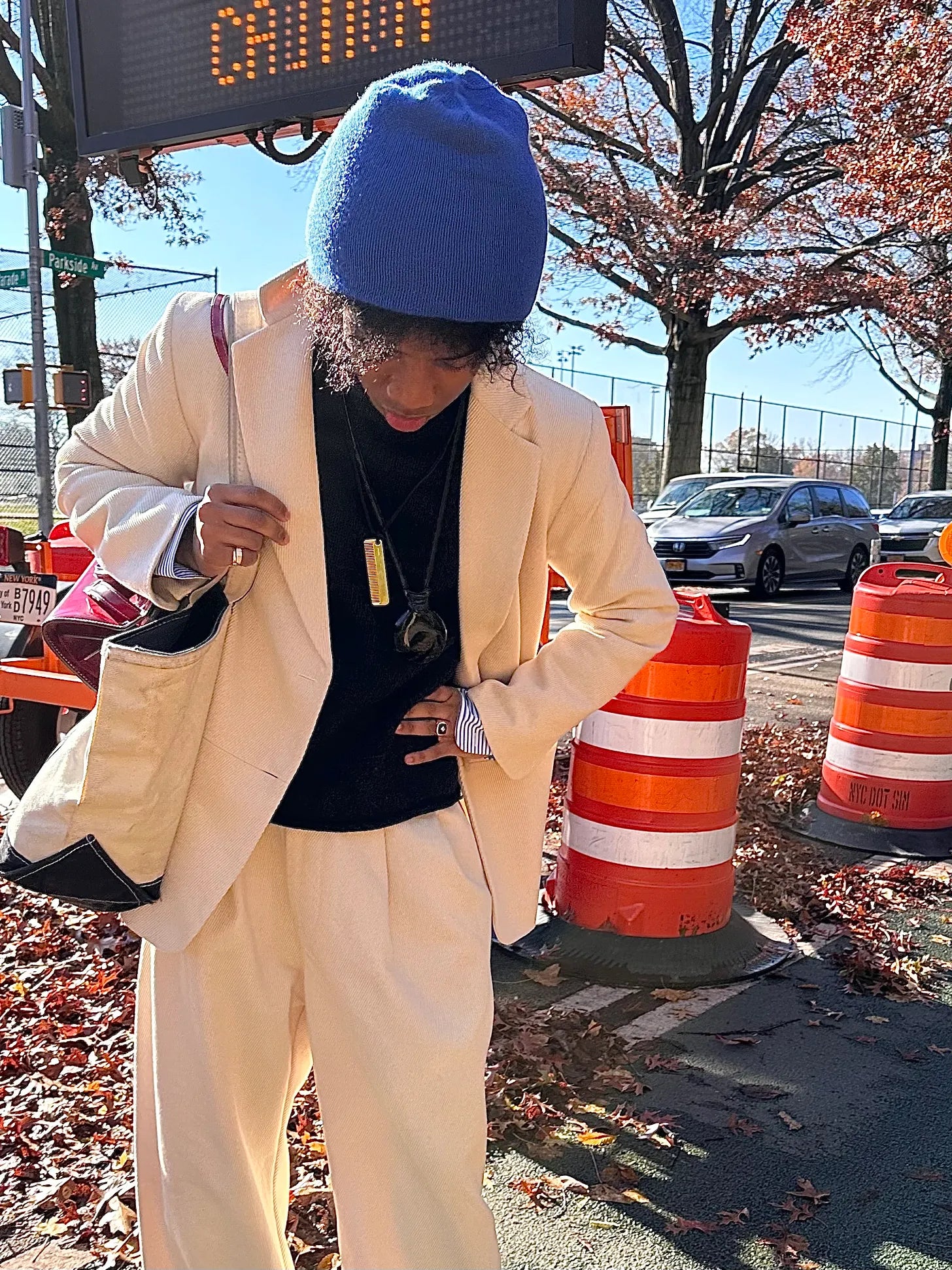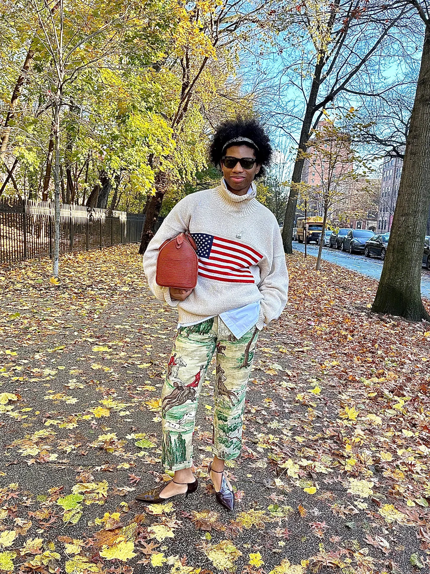 I still want to look dressed up, but also feel comfortable, a bit cozy. You get that with the sweater and pants. I got the sweater on eBay — my search term was “American flag Ralph Lauren turtleneck sweater.” I was walking down Mulberry Street just beforehand and saw these two women fully decked in Ralph (orRalphism, really — one had on a beaten hat that didn’t have any insignia but looked like it belonged to his world) and at first, I was just amazed at their commitment to encapsulating the brand, then I did a double take, noticed the sweater and was likeoooh, that’s really nice,so I went home and launched my search.