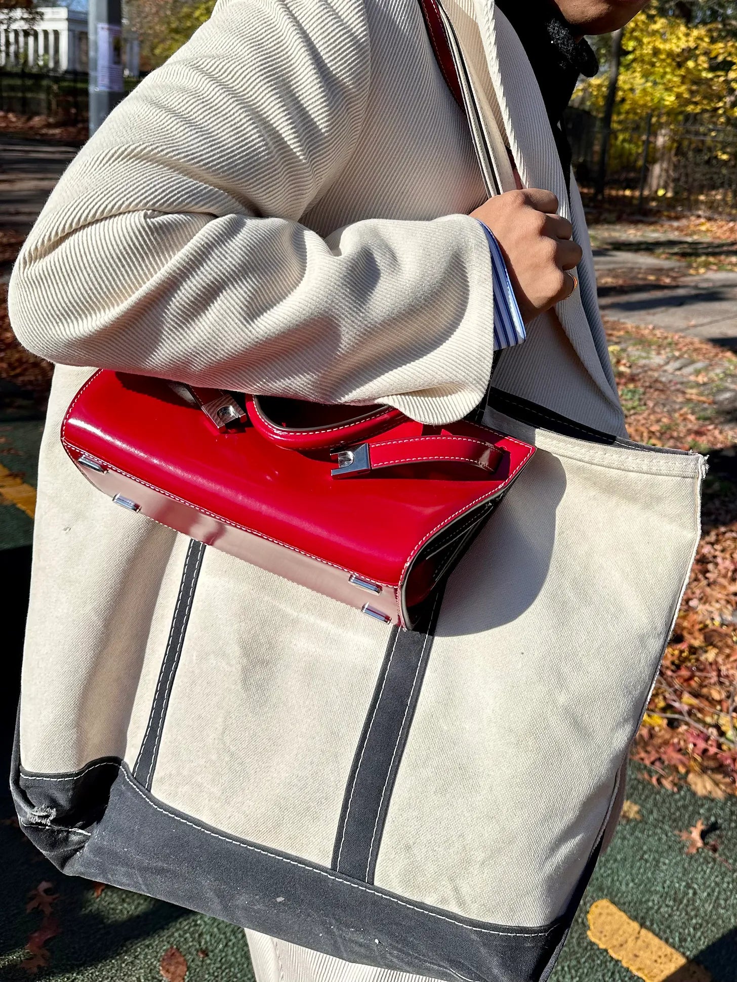 L.L. Bean classic tote, Tory Burch red bag (but this one’s30% off!)