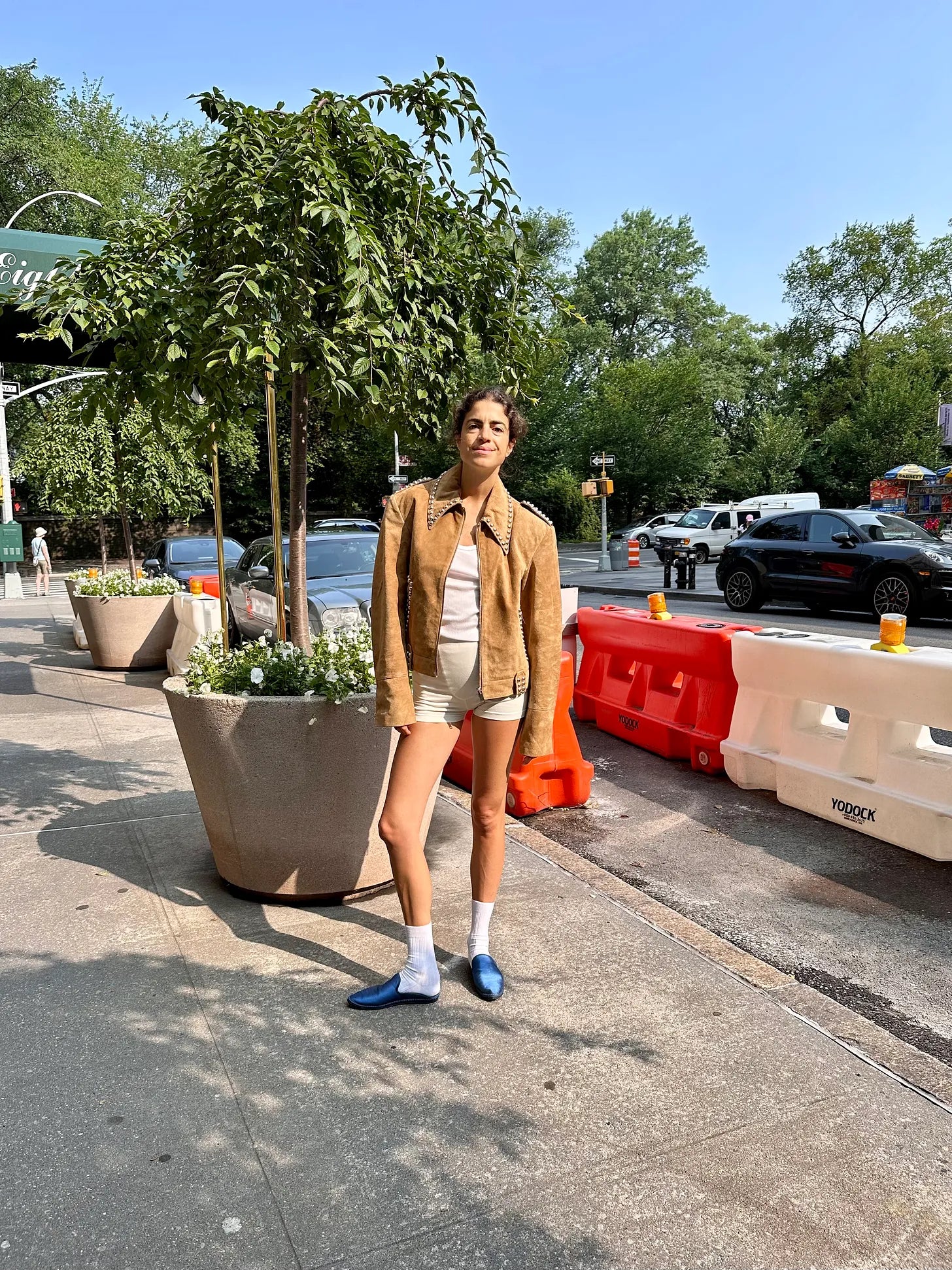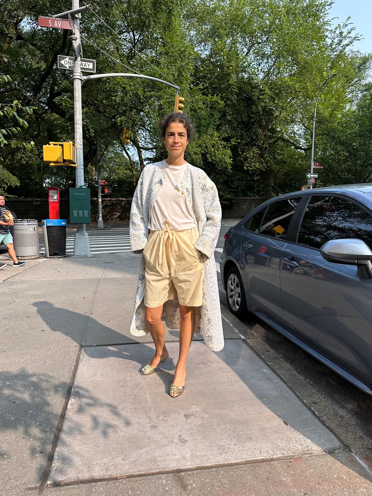 Une Femme NY housecoat, white t-shirt from The Row (this is a good fit ref), Souer x Cafe Leandra shorts, and these slippers were my grandma’s — she says she wore them around the house when she had company
