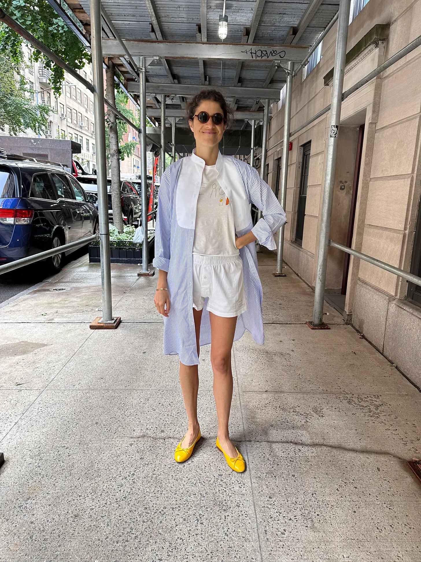 Sessei shirt dress (this one from Marni has a lot of character too), The Row t-shirt, Entireworld mens boxer shorts (these from Eterne are a great comp; for more rigid cotton, these from J. Crew will do. If you like the de facto men’s aspect, these from James Perse are good, and for something shorter, I recommend these sized up x 2 or 3), Chanel ballet flats (because the structured flat — these from Manolo might be the new reference point! — adds the element of not-home-ness), Delarge sunglasses