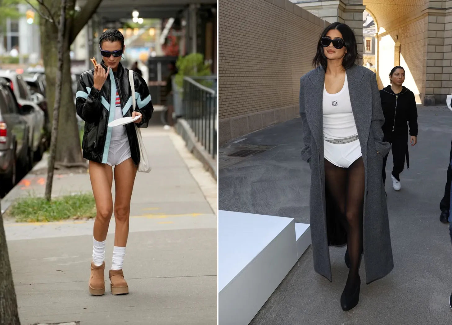 Bella Hadid eating pizza on the streets. ofNew York last September (2022) at left, Kylie Jenner in literal tighty whities at the Loewe show in Paris last October (2022)