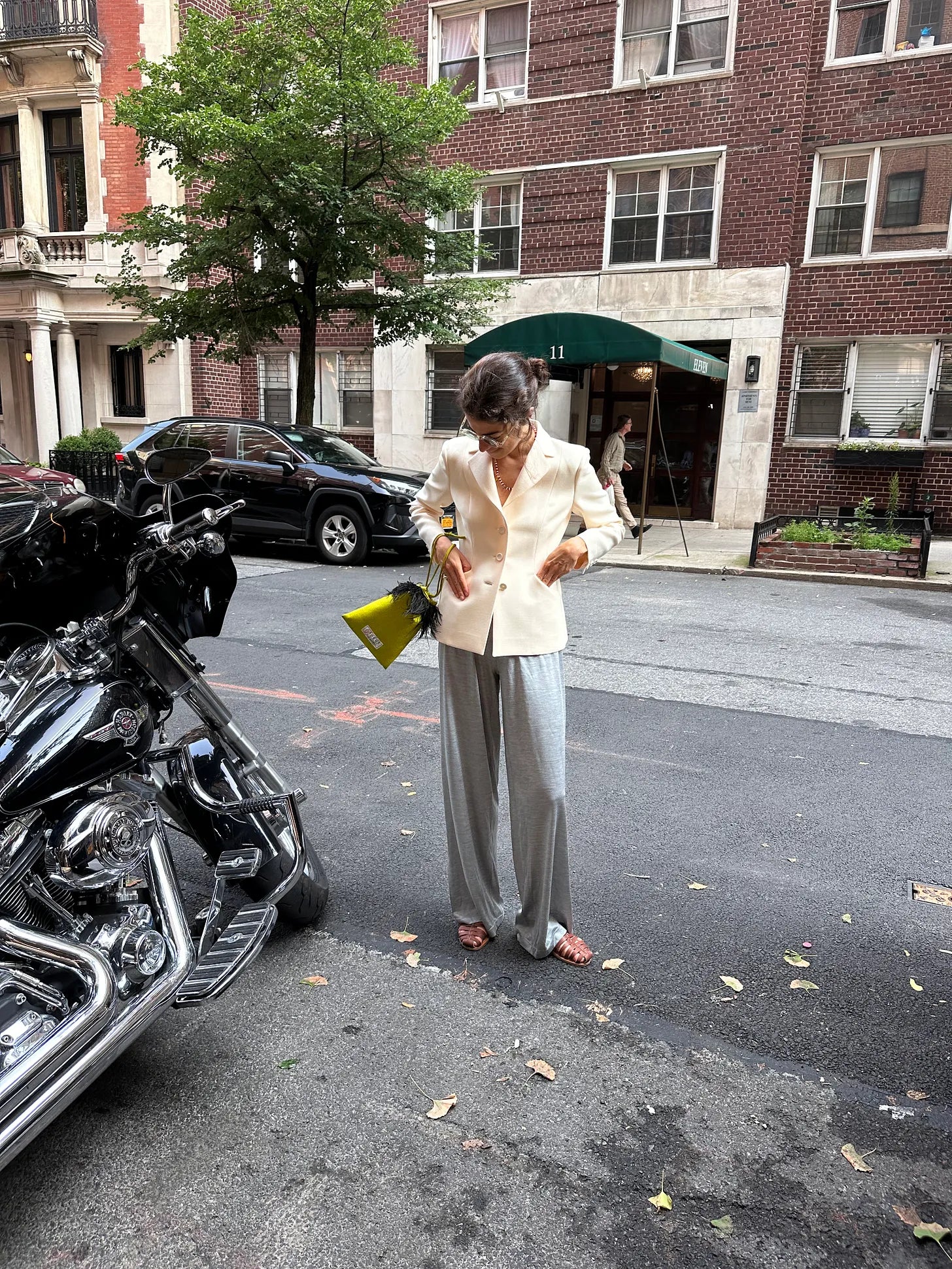 Dior blazer — but anything slightly cropped and single breast in your closet will be a good enough foil to pajama pants , K. Jacques fisherman shoes, Cafe L x Soeur bag, Ileana Makri beads
