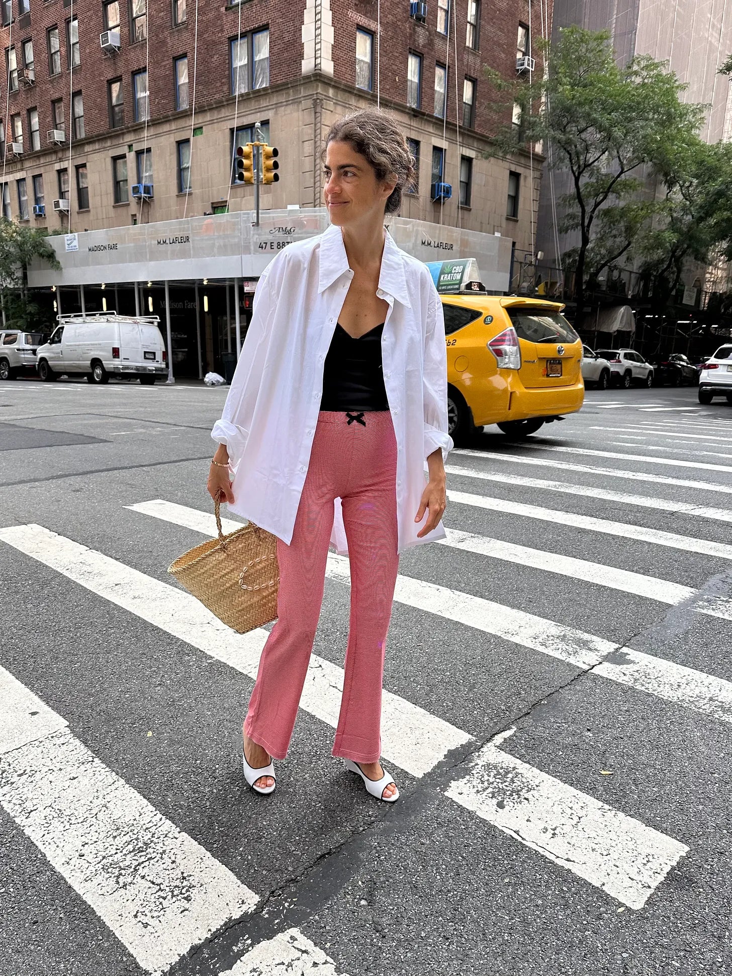 Amotea oversize button down (would suggest wearing an oversize white as a dress with a tie belt too), St. Agni black silk tank, Caro stiped pants, Renate Jacob wedges; go the Amina Muaddi route if you’re looking for a bit more zhuzh, Paris Texas for a refined toe and good price