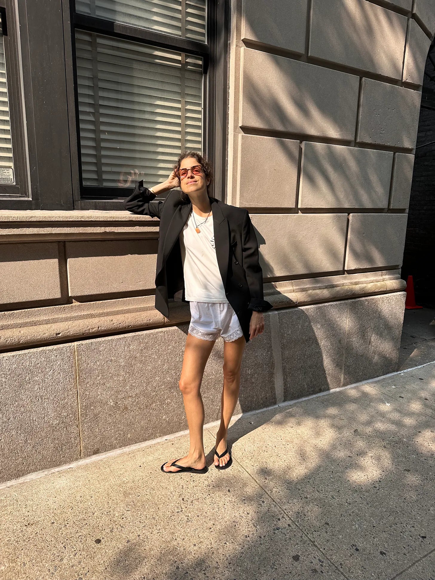 Explicit Poets sunglasses (also cool), Wardrobe.nyc blazer (this one in partic wears pretty well and is seasonally versatile because of the weight of the wool), (also good), Marine Serre shorts (these are amazing too), and here's a good white t-shirt comp from Cos and if you don’t have a pair of black Havaianas yet, mayyyyyyy I ask whyyyyyyyyyyy