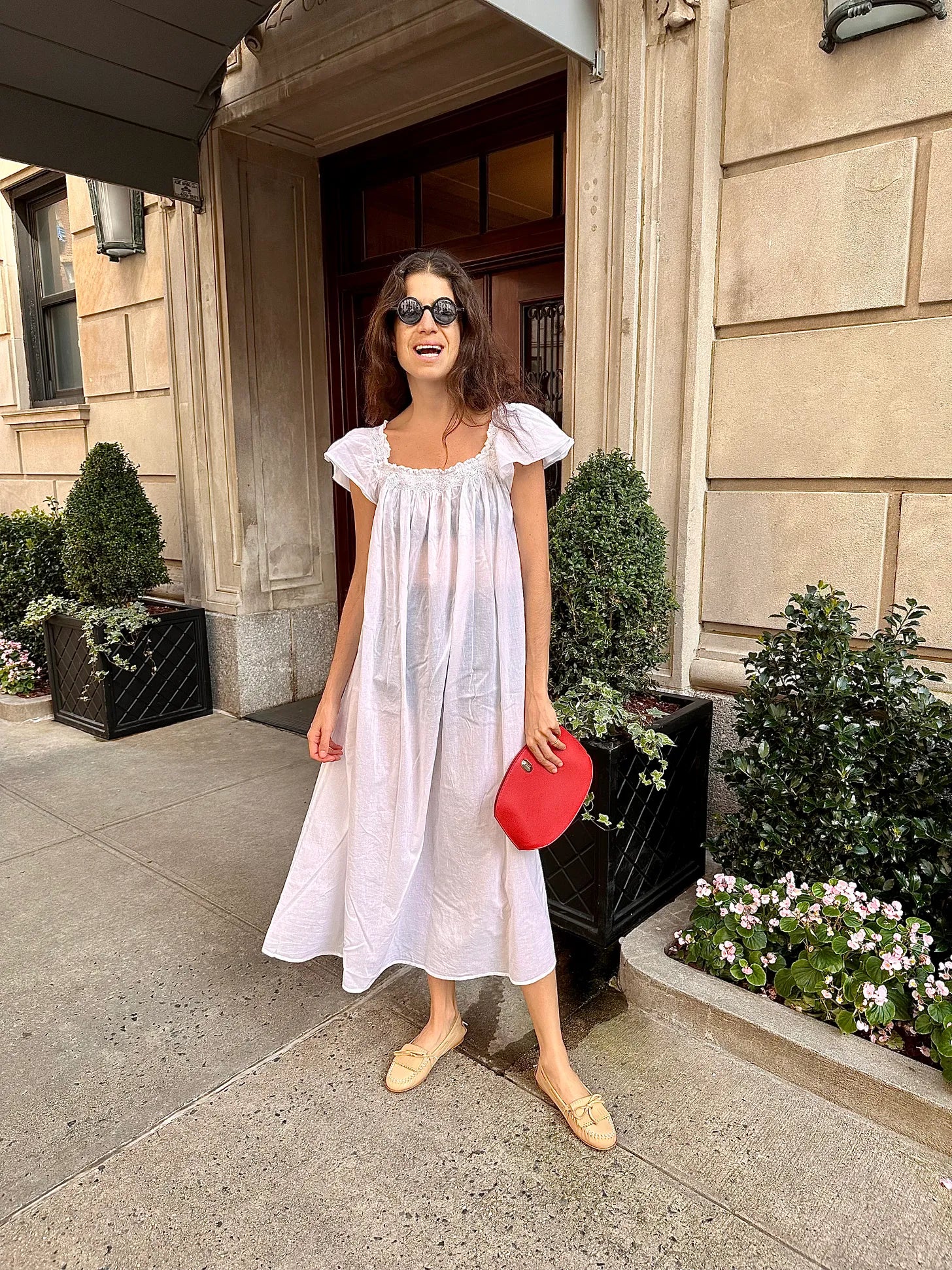 You’ll pair your nightgown with either flip flops/fabric slides and a leather bag to achieve the 2:1 effect, or with closed-back shoes that are still extremely casual but do incorporate a new dynamic, figure like these moccasins (or a pair of fisherman sandals/mesh slippers/loafers).