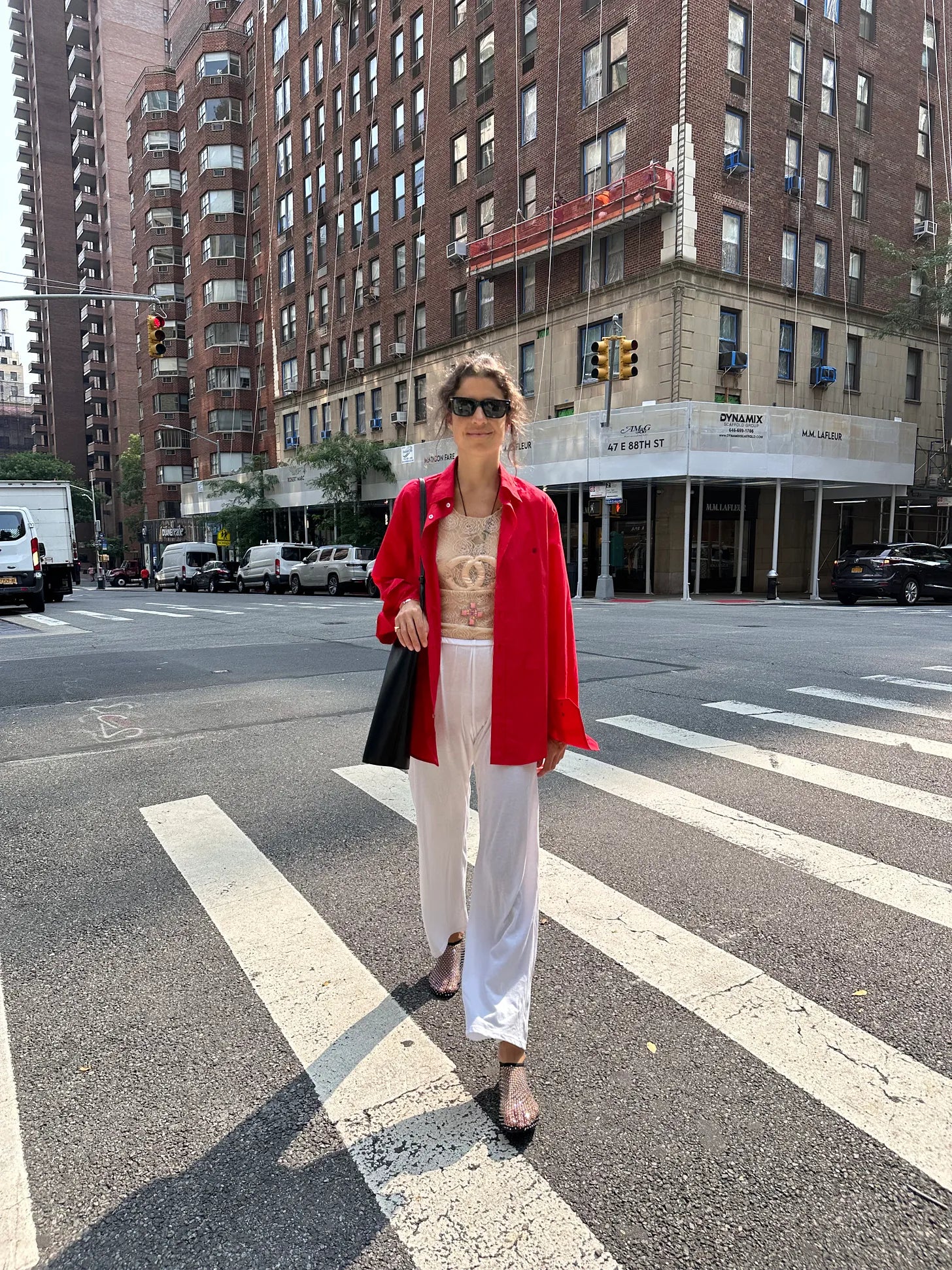 CH Carolina Herrera mens button down (here’s a good red comp for you), vintage Chanel lace tank, Donni cotton pants (great alt; Skims has some good ideas too) Christopher Esber shoes — these are fun/ny too and then these from Warby Parker are good for the sunglasses.