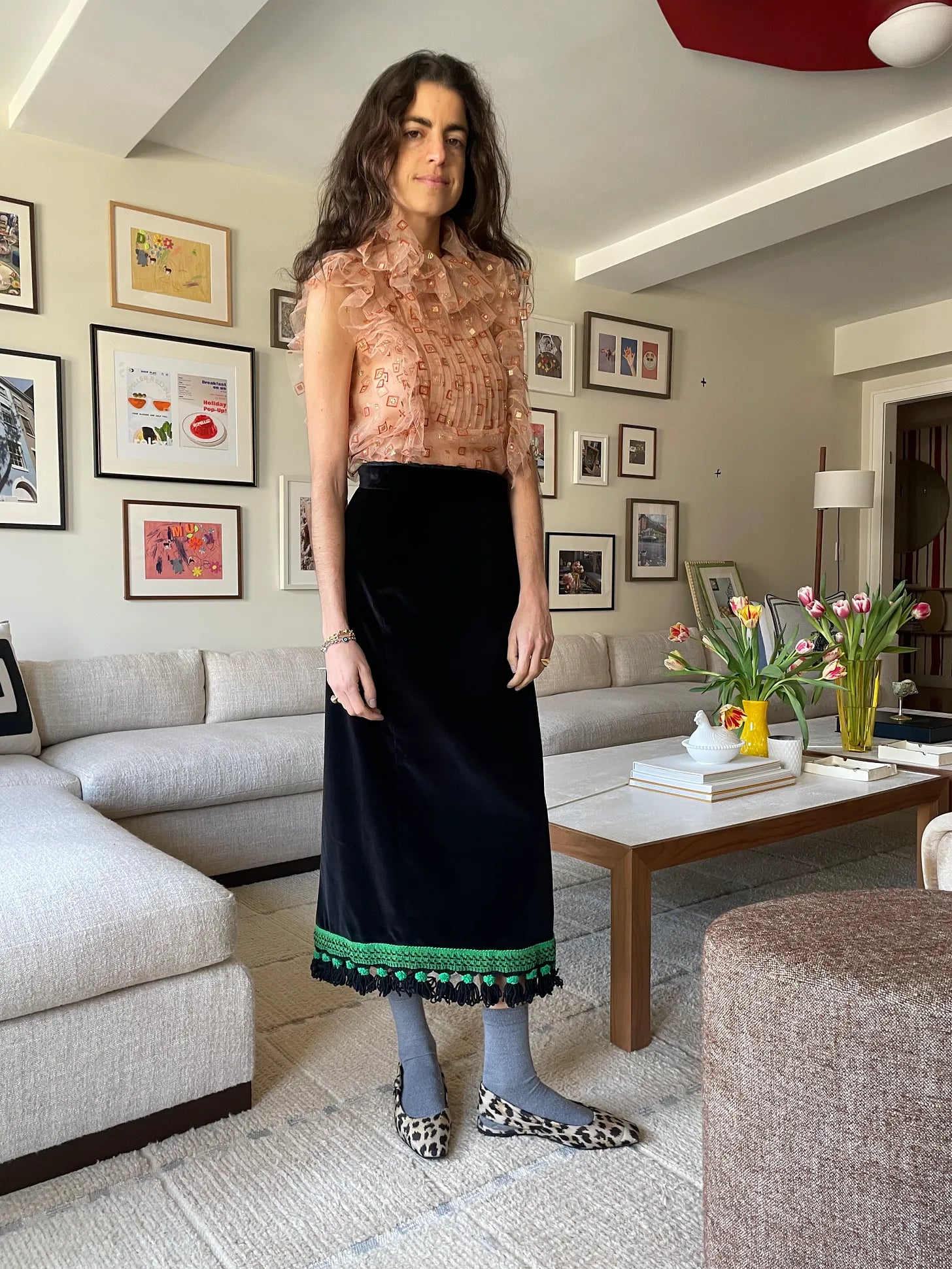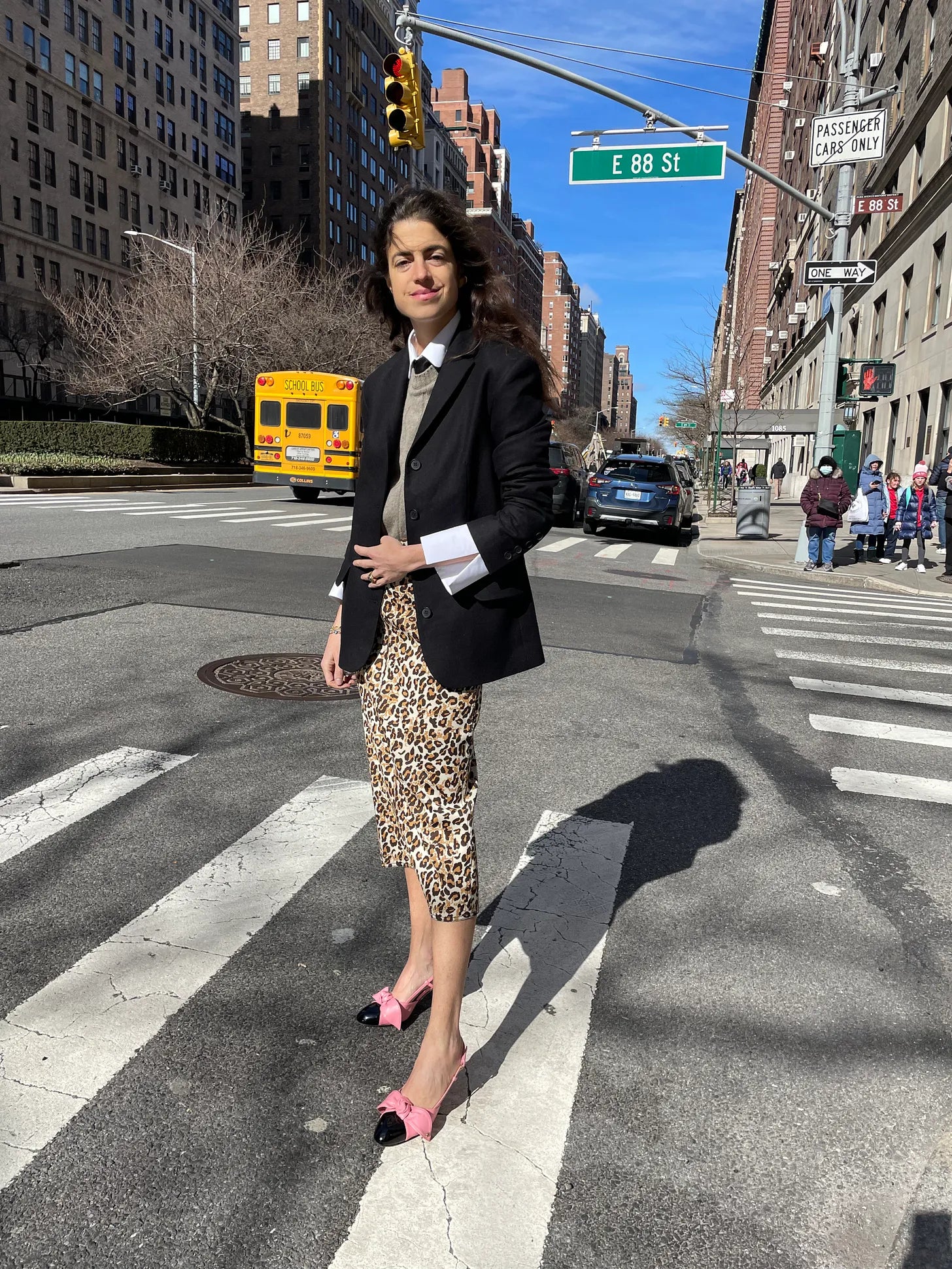 A mid-length straight skirt is more matronly than anything else, which when paired with this style of shoe — a slingback ballet flat — reads pretty conservative. The silhouette pairing then makes room for a bit more flexibility as far as flair, enter the leopard print and that tassel fringe.