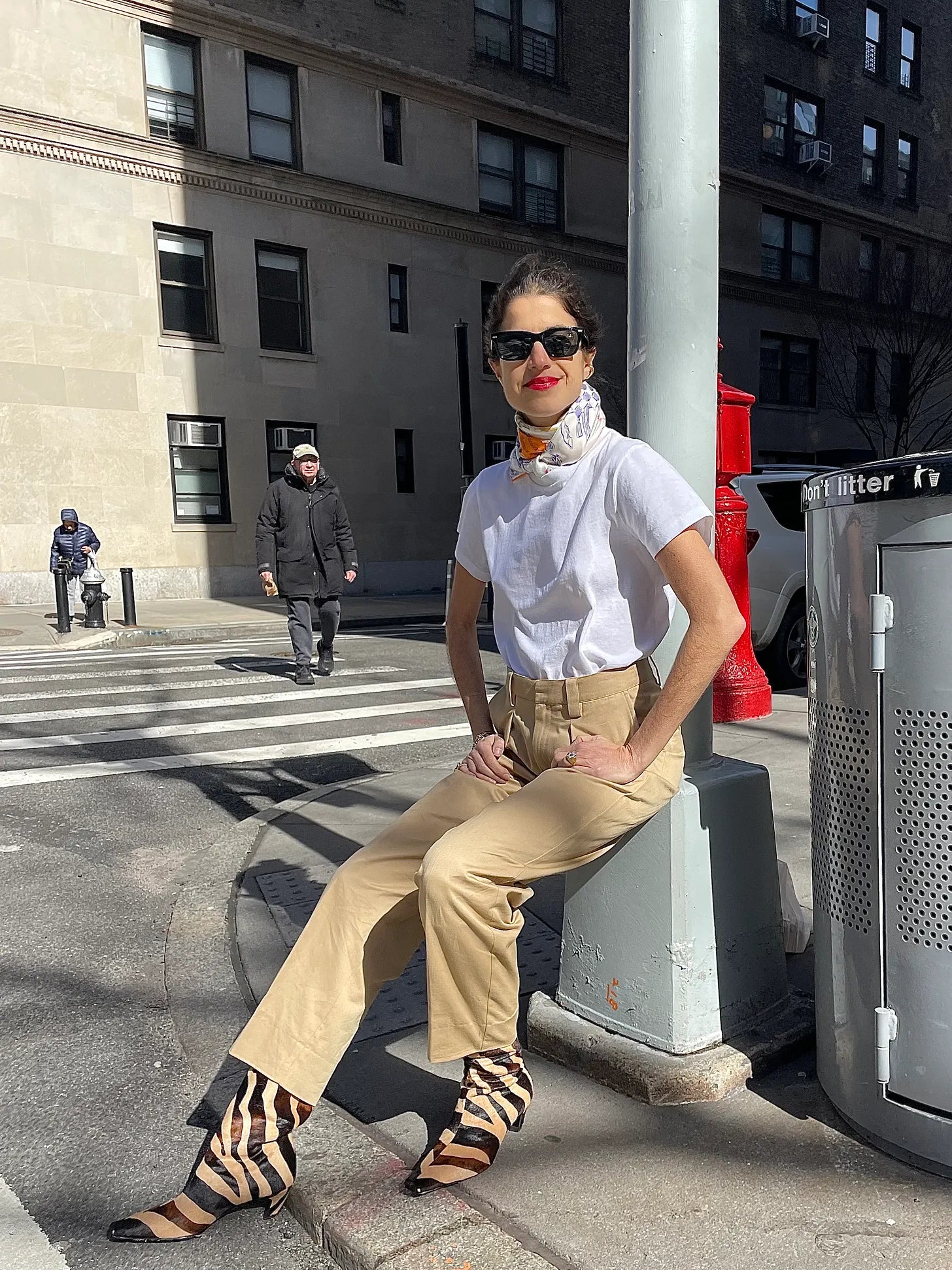 A silk scarf, black sunglasses and red lipstick on the other. What you’re left with instead is a good quality pass at how to make the best of boring clothes. And the combo of red lipstick and animal print, me thinks, connotes a sense of fffffffffffffffffffffun that misaligns with the khakis and t-shirt, you know? Like I think I would trust someone who wears a sensible outfit but gets freaky with their accessories more than anyone else. It seems like the right balance to live a good thing.