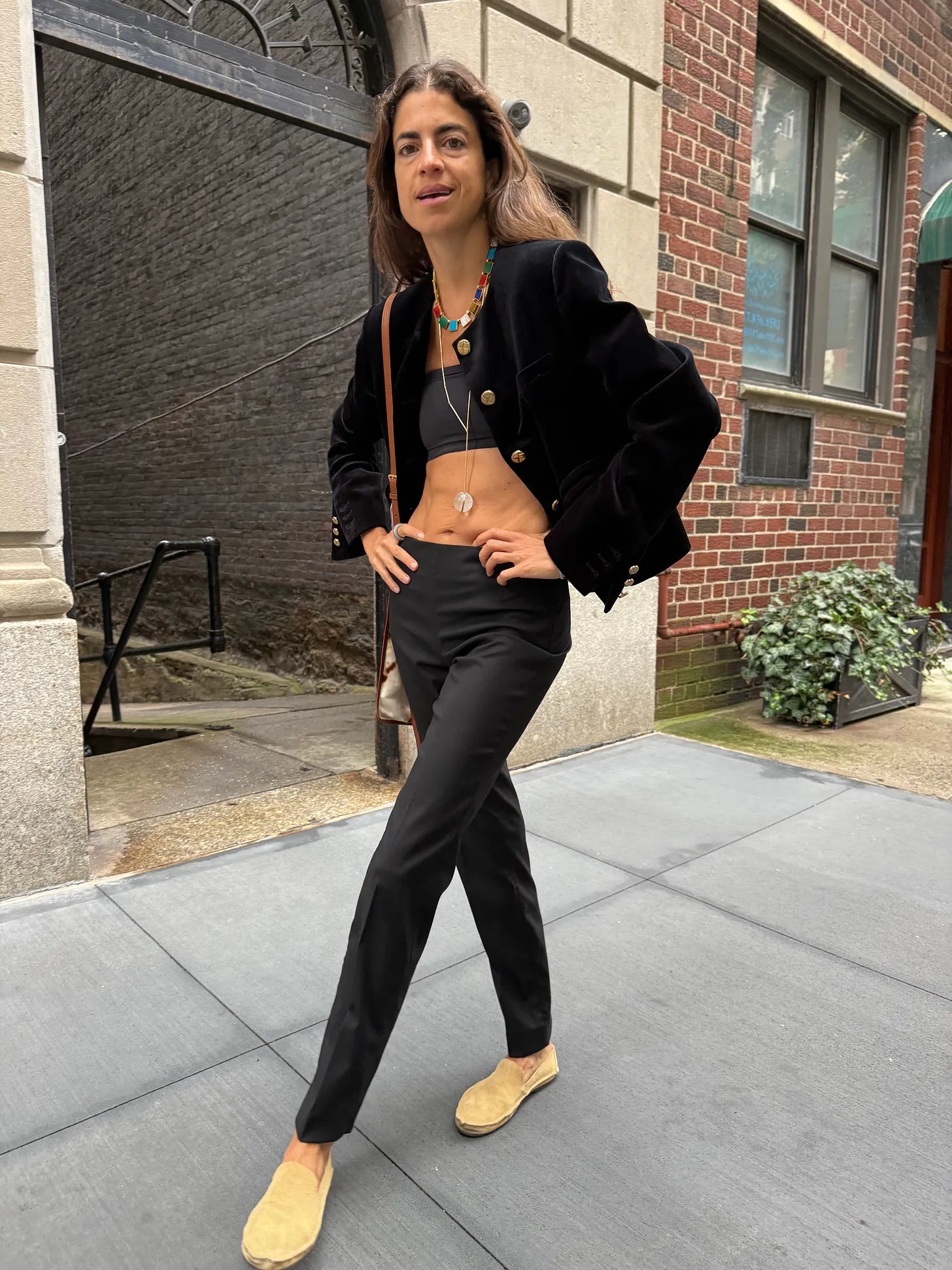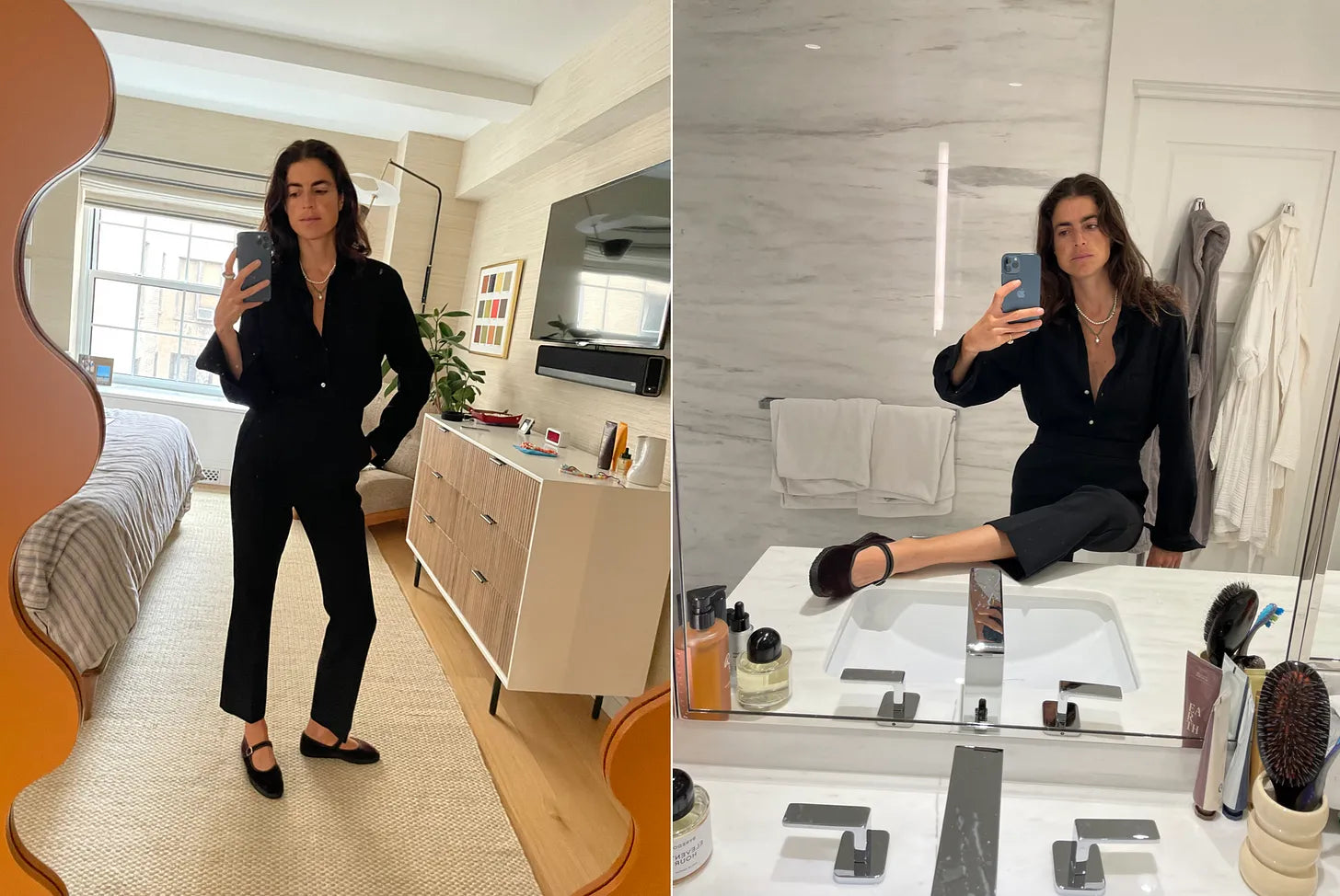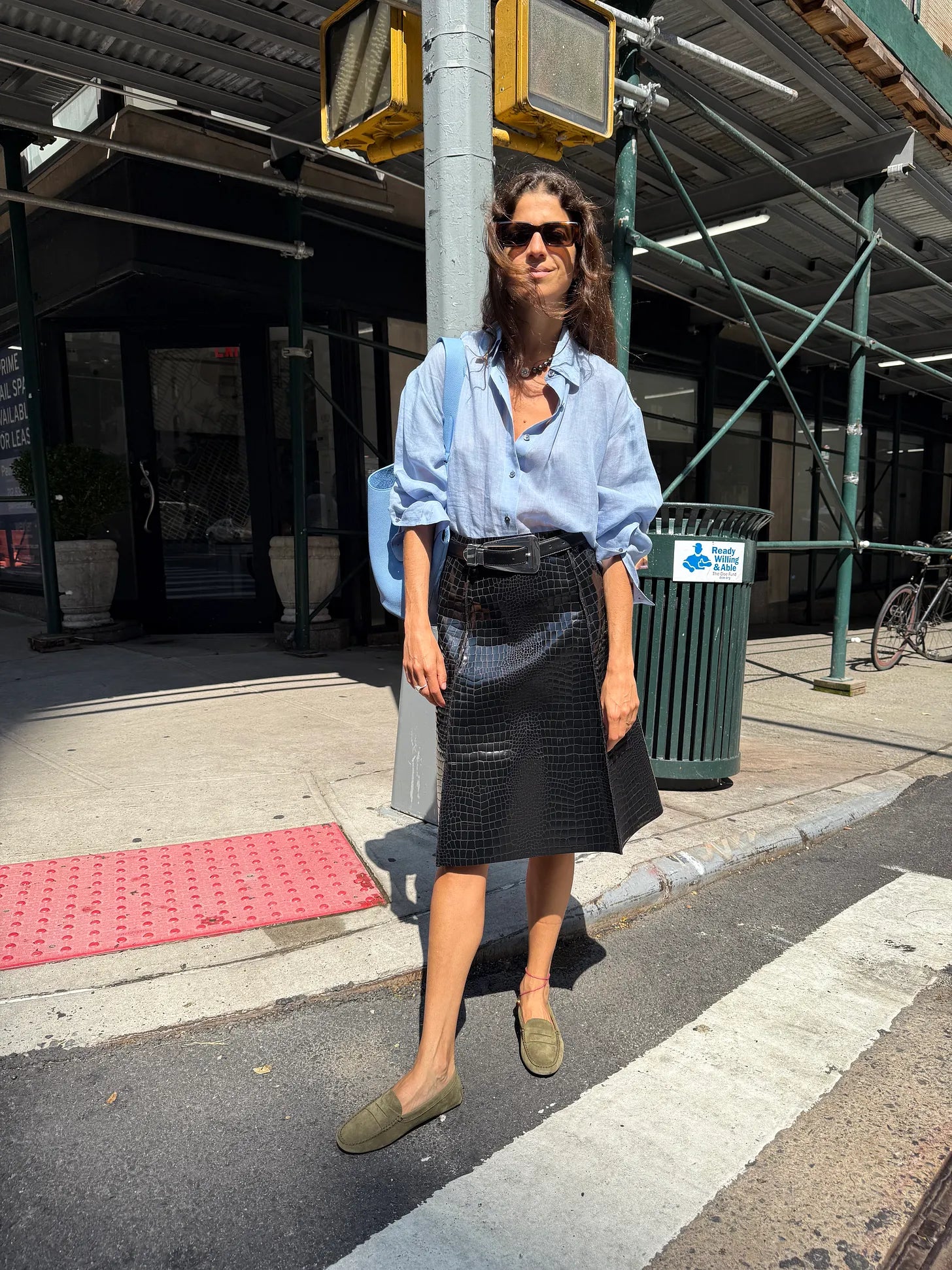 Khaite black t-shirt (this is what’s available now, but mine’s a more cropped version — here’s another good black tee), Wardrobe.nyc skirt — mine is this one, but this one’s a fresher take on the upcoming season; also love the one by Maria McManus and if you’re looking for more character, here’s Courreges), Cayumas mary janes
