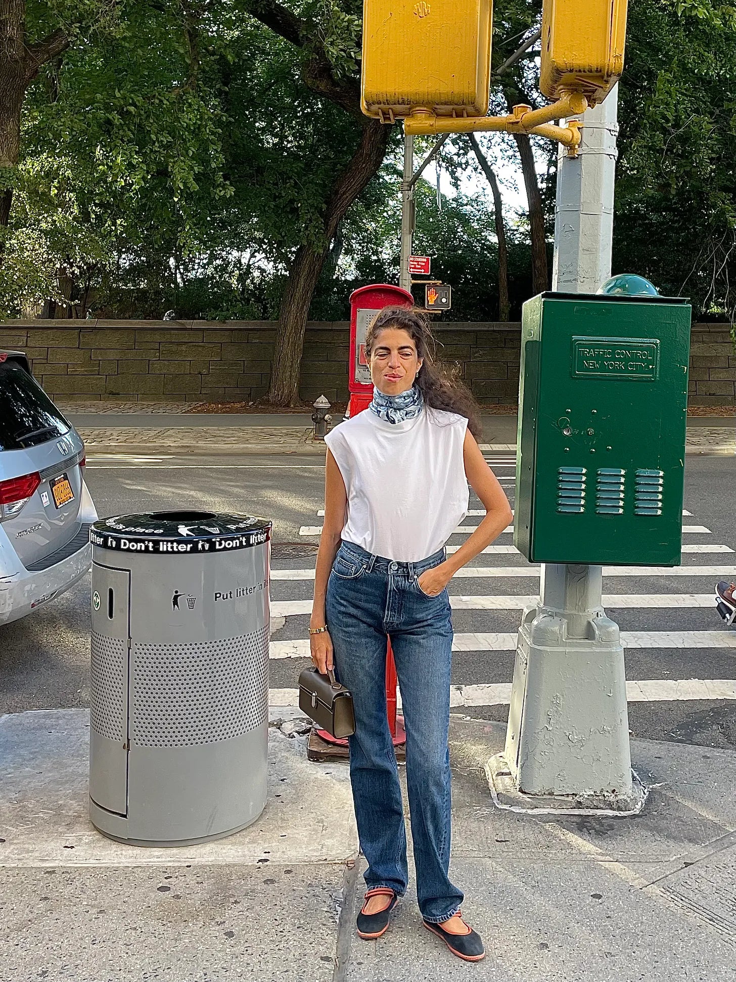 As an unexpected chill point with jeans. I talk about this all the time, but maintain that jeans suck with shoes that aren’t sandals. Something about every other combination to which sneakers used to be the exclusion reads boring for whatever the reason, which I think I just realized is because most shoes that aren’t sandals read too structured w jeans unless the jeans are ripped, which more and more lately I feel less inclined to wear. Enter these folding genies which I paired with a tapered pair — the closest thing I have to trousers though per last week’s Letter of Rec, these are likely incoming. I’d have used a sleeveless turtleneck if I had one (here’s one!), but made-shift a muscle tee and neck-scarf into one.
